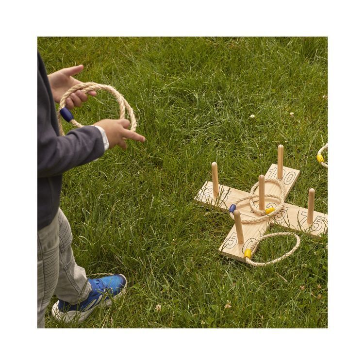 Ring Toss je hra, ve které potrénujete svoji mušku při házení kroužků na dřevěný terč. Hra obsahuje: dřevěný rám s pěti kolíky, 6 kroužků (3 žluté, 3 modré).