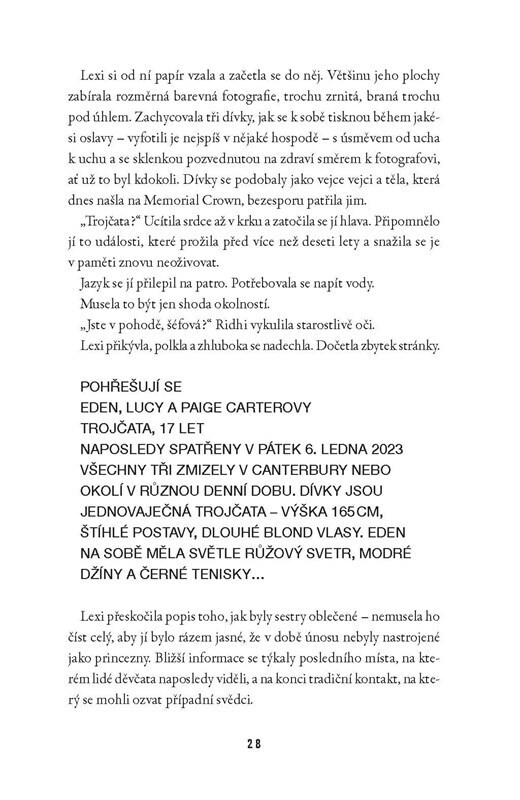 Kdesi v Canterbury leží na ztichlé stráni dvě dívky. Ve vlasech mají diadém, každá v ruce svírá rudou růži. Mohlo by se zdát, že spí… ale mají podříznutá hrdla. Policie záhy zjistí, že jde o dvě ze tří sester a ta poslední se pohřešuje. Pro inspektorku Lexi Bennettovou je mrazivý případ osobní....