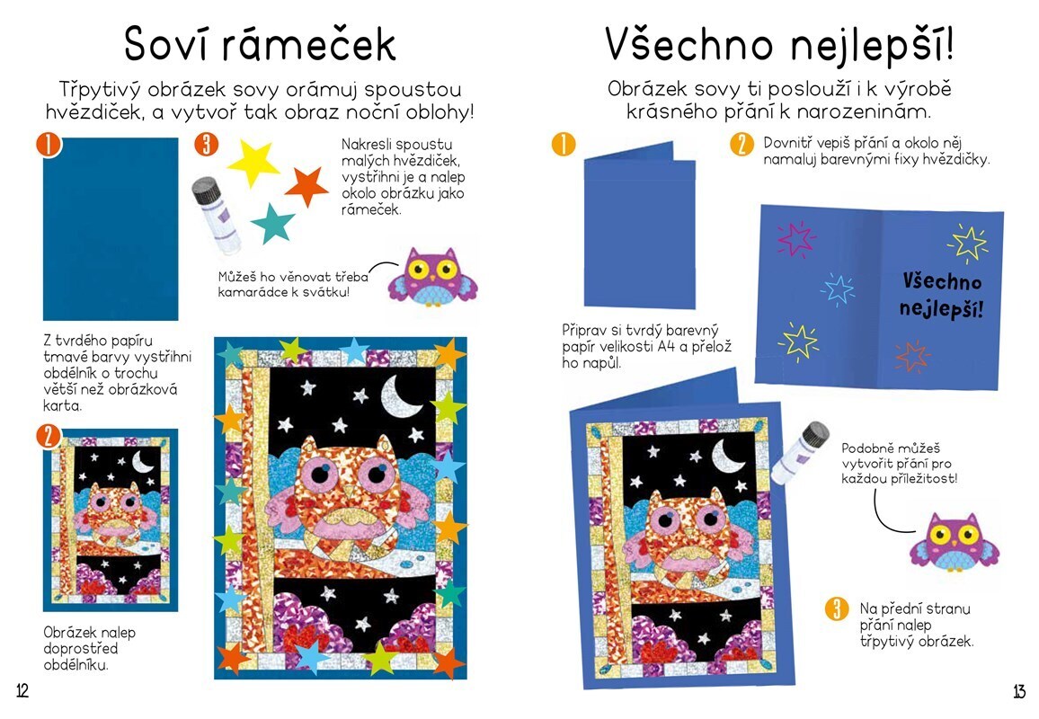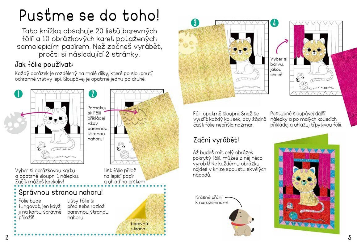 Knížka s obálkou obsahuje 20 listů barevných fólií a 10 samolepicích obrázkových karet. Pomocí postupného přikládání barevných fólií si obrázkové karty můžeš vyzdobit dle své fantasie, a pak z nich vyrobit například krásné přání k narozeninám, originální obal na tajný deníček či ozdobnou cedulku...
