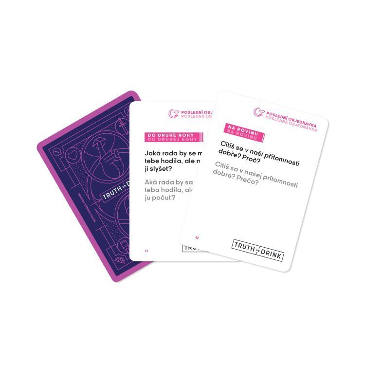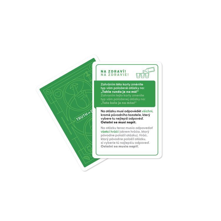 Karetní hra Truth or Drink je založena na populární stejnojmenné sérii na sociálních sítích. Základní premisa hry zní: “Odpověz, nebo se napij!” Hra funguje tak, že hráč vybere jednu kartu s otázkou a následně 2 osoby, které musí na tuto otázku pravdivě odpovědět. Hra obsahuje: 432 karet...