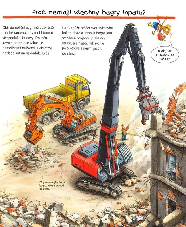 Kdo by neměl rád bagry, náklaďáky, jeřáby a další stavební stroje? Knížka s otevíracími okénky dětem ukáže, co se na staveništi děje. Můžou si prohlédnout demoliční bagr, který zbourá celý dům, podívají se do asfaltérky nebo do vozu s míchačkou na beton.