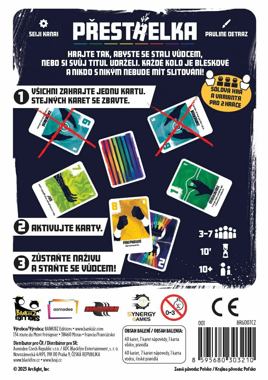 Přestřelka je hra, která hráče staví do velmi zranitelné pozice! V jediném kole může být vyloučeno více hráčů a hra může skončit během okamžiku. Rozhodněte se co nejlépe a užijte si tuto nevídanou vysokooktanovou akci! Přestřelku můžete hrát i sólo nebo ve dvou