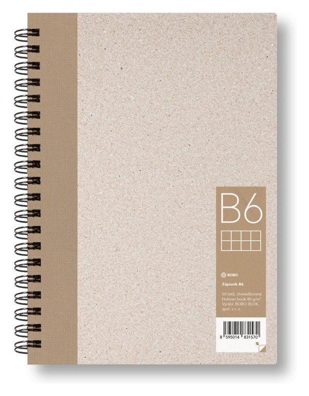 kreslení. br brZápisník, čtverečkovaný, B6 br• Formát: B6 br• Lineatura: Čtverečkovaná br• Počet listů: 50 br• Papír: Holmen Book Cream 80g br• Vazba: Dvojitá kroužková spirála Twin Wire br• Pevné desky vyrobeny z papírové lepenky br• Barevné knihařské plátno br
