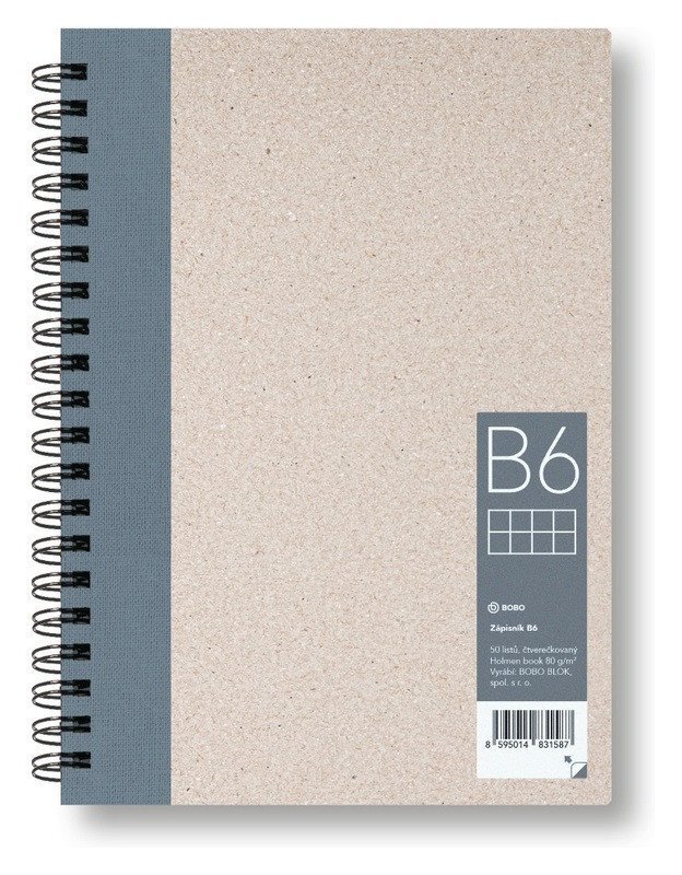 kreslení. br brZápisník, čtverečkovaný, B6 br• Formát: B6 br• Lineatura: Čtverečkovaná br• Počet listů: 50 br• Papír: Holmen Book Cream 80g br• Vazba: Dvojitá kroužková spirála Twin Wire br• Pevné desky vyrobeny z papírové lepenky br• Barevné knihařské plátno br
