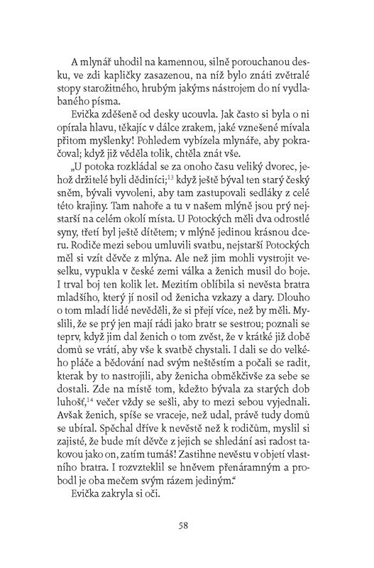 U kříže u potoka potká Evička Štěpána, který se do ní zamiluje a chce si ji vzít. Štěpán ale pochází z prokletého rodu – v rodině Potockých nemá nikdo štěstí v lásce. Evička jejich příběh zná, ale i tak se rozhodne, že kletbu oné rodiny věrnou láskou ke Štěpánovi zlomí. Přijme jeho žádost o...