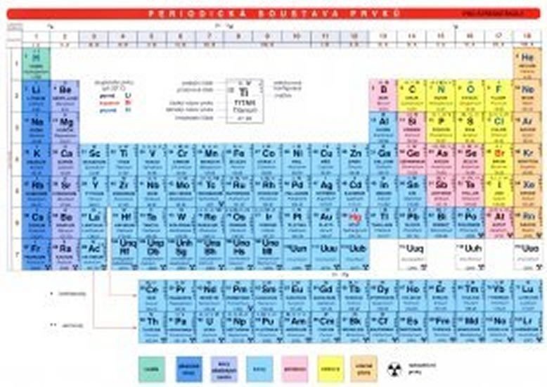 U každého prvku je uvedena jeho značka, oxidační číslo, hmotnostní číslo, protonové číslo, český a latinský název. Barevně označené je skupenství prvků, radioaktivita a rozlišení na kovy, alkalické kovy, kovy alkalických zemin, polokovy, nekovy a vzácné plyny. Druhá