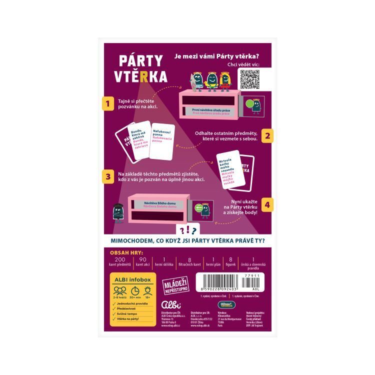 Párty kam jeden nepatří! Párty, na kterou se někdo vetřel. Zjistěte, kdo na oslavě nemá co dělat dřív, než on zjistí, kam vlastně zabloudil. Párty hra pro 2-8 hráčů. Hra obsahuje: 200 karet předmětů, 90 karet akcí, 1 herní skříňku, 8 filtračních karet, 1 herní plán, 8 figurek a česká a slovenská...
