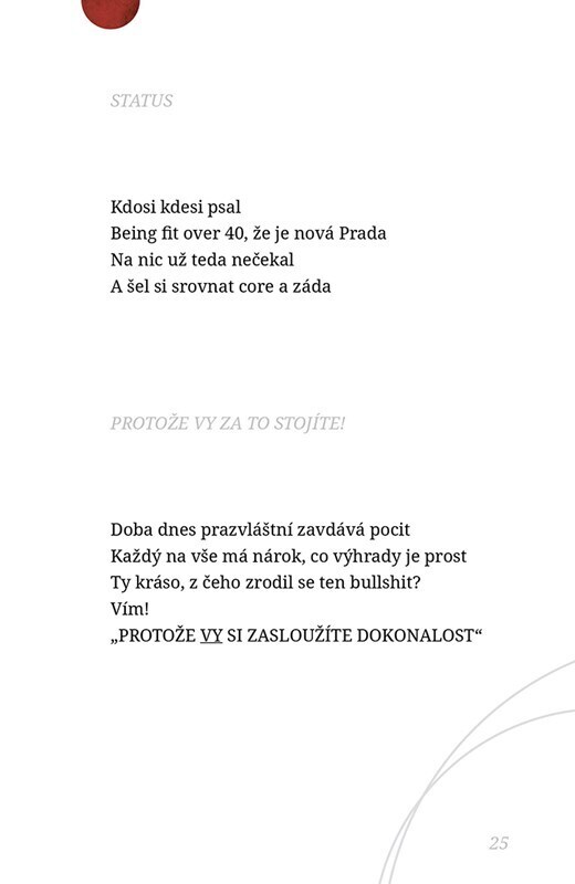 Užs to říkal Verče Že nesnášíš verše? Tohle AA BB se však Nepodobá ni za mák Holanovi, Máchovi (bohužel) Leč k tobě, bro, snad promluví Něco zjevných pravd se dozvíš V nízkém hloubku lovit musíš Chceš mít v kostce hlavní závěr? Dávkuj houby – na schízu ser! Kýbly klišé, tuny kýče Furt nemáš rád?...