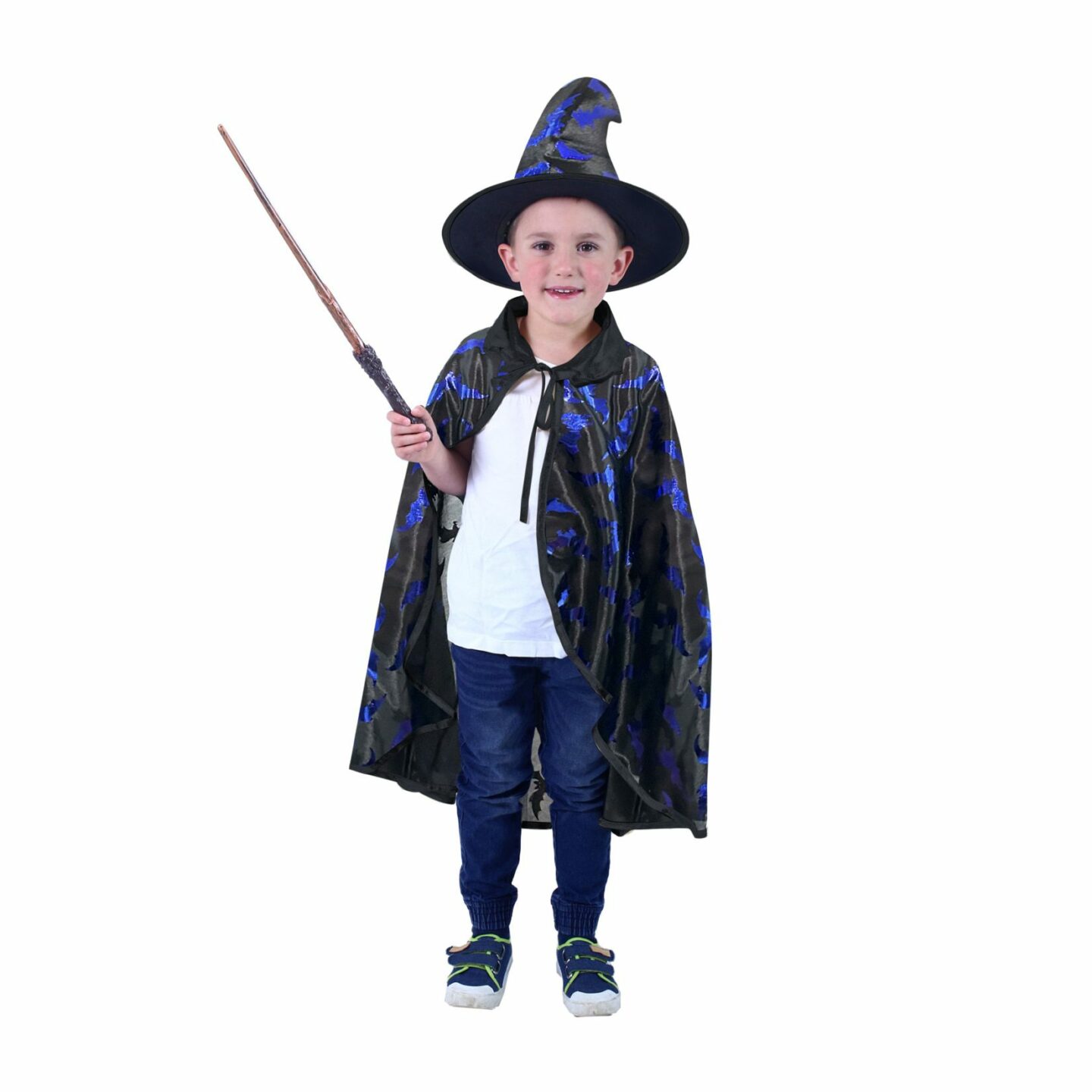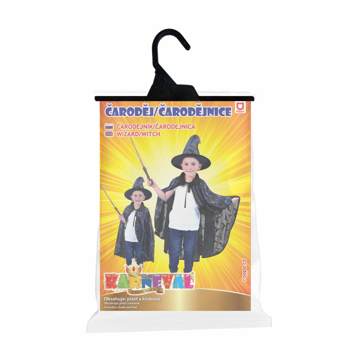 Perfektní souprava pro všechny čarodějnice nebo čaroděje na párty, karneval nebo oslavu Halloweenu! Balení obsahuje čarodějnický plášť černé barvy s modrofialovým potiskem netopýrů a k tomu perfektně sladěný klobouk. V těchto kouzelných doplňcích tě určitě nikdo nepřehlédne! Určeno pro děti od...