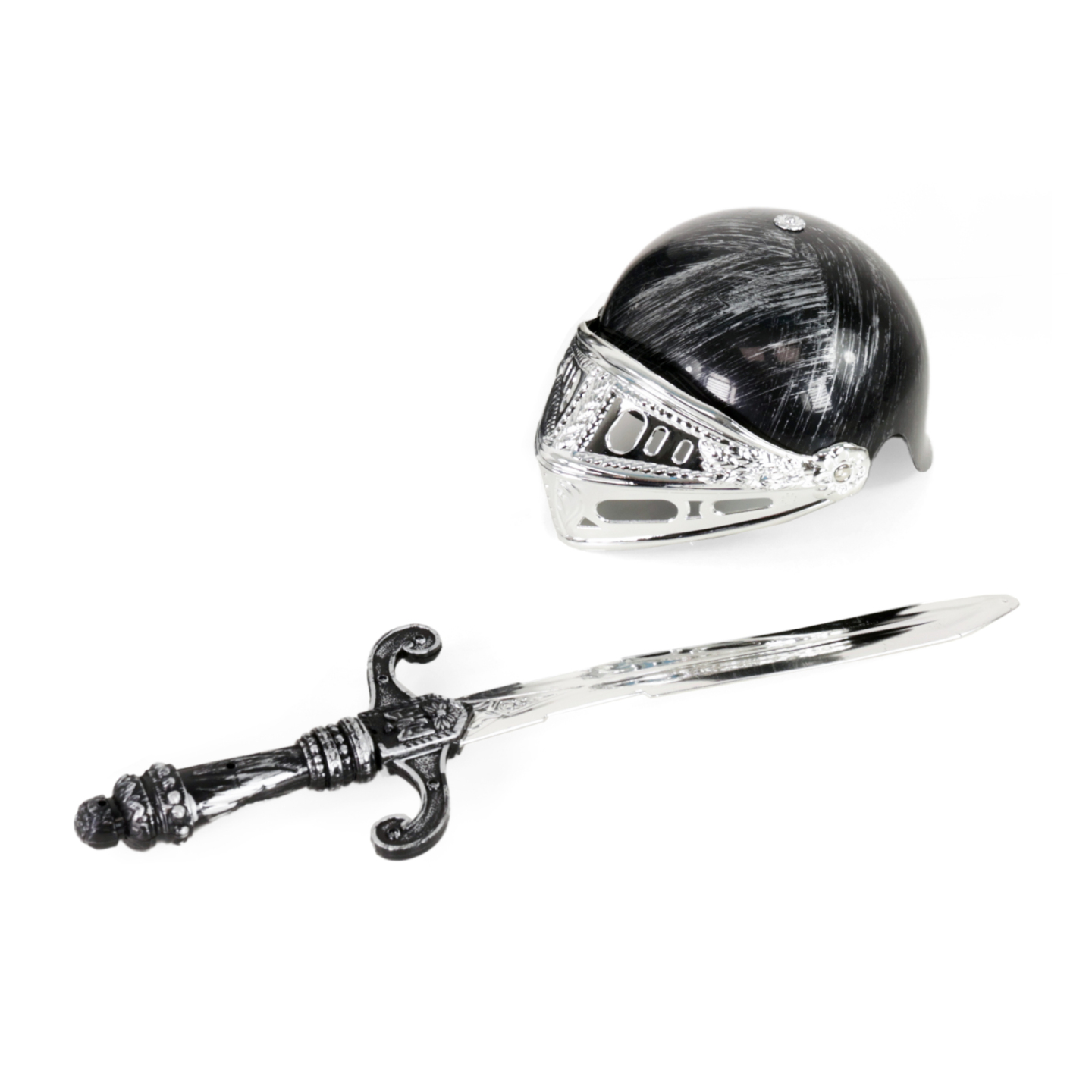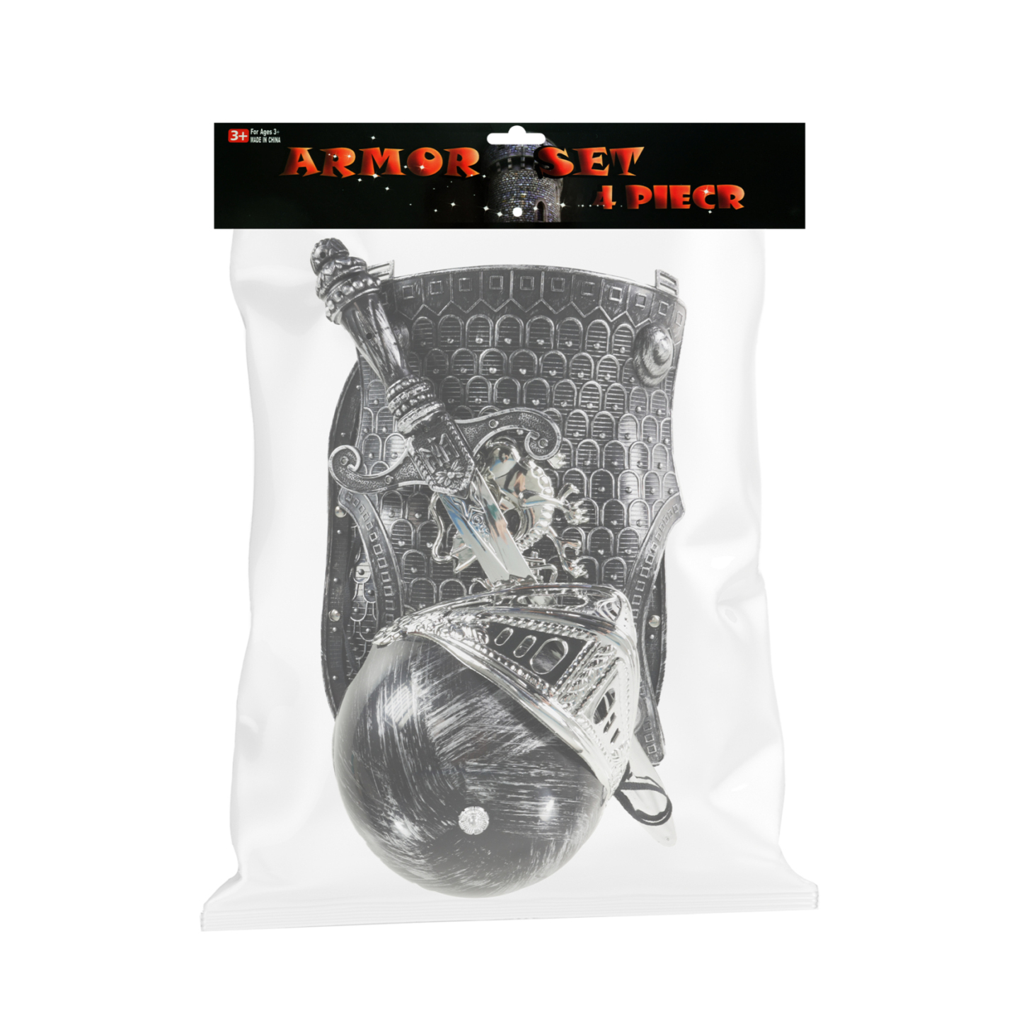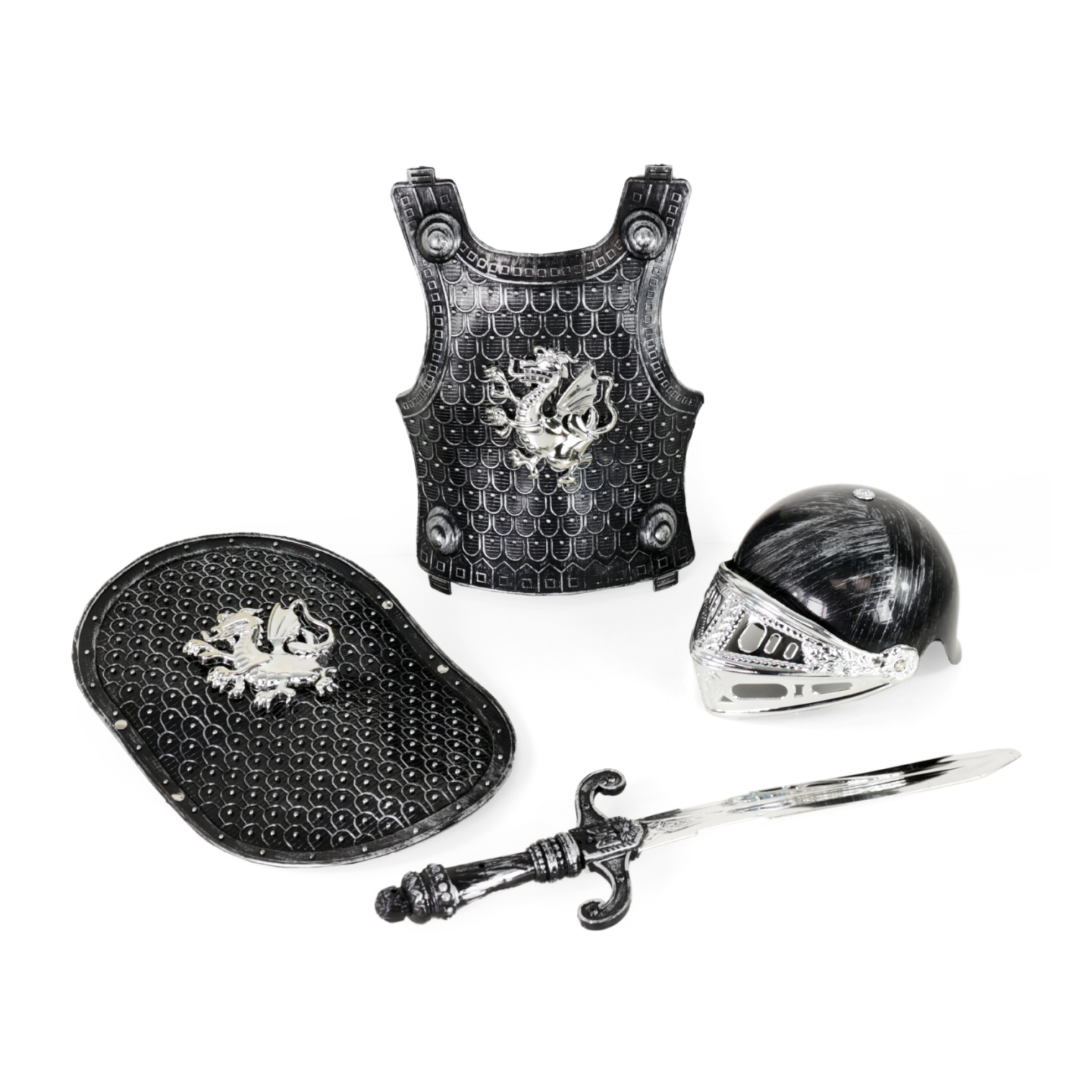 Popadni meč, nasaď si ochranný štít, přilbu a vzhůru do rytířského boje! Tahle sada obsahuje stříbrný meč, ochranný štít s erbem draka, helmu s krytem a rytířskou vestu. Vše je vyrobeno z PVC. Meč je dlouhý cca 49 cm.