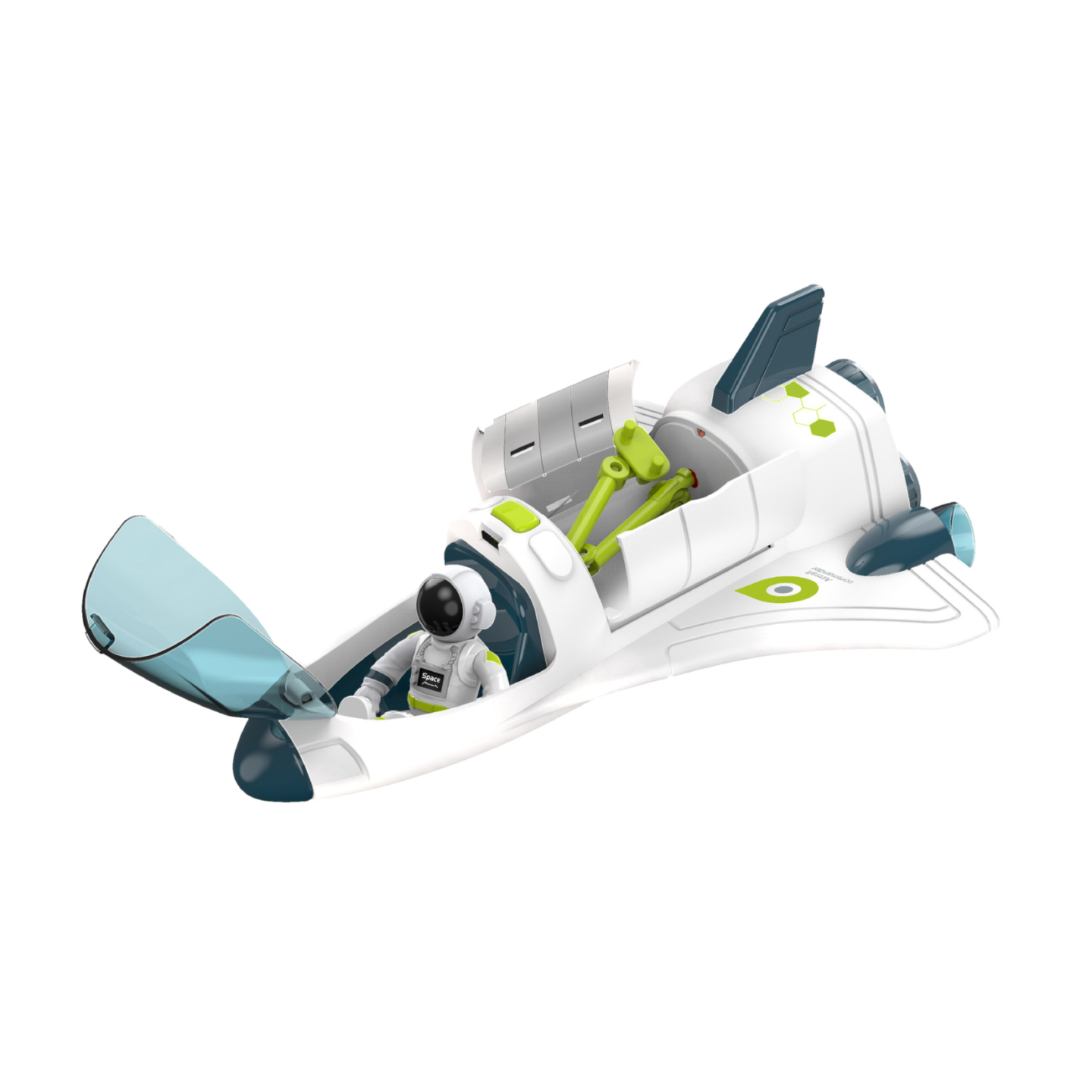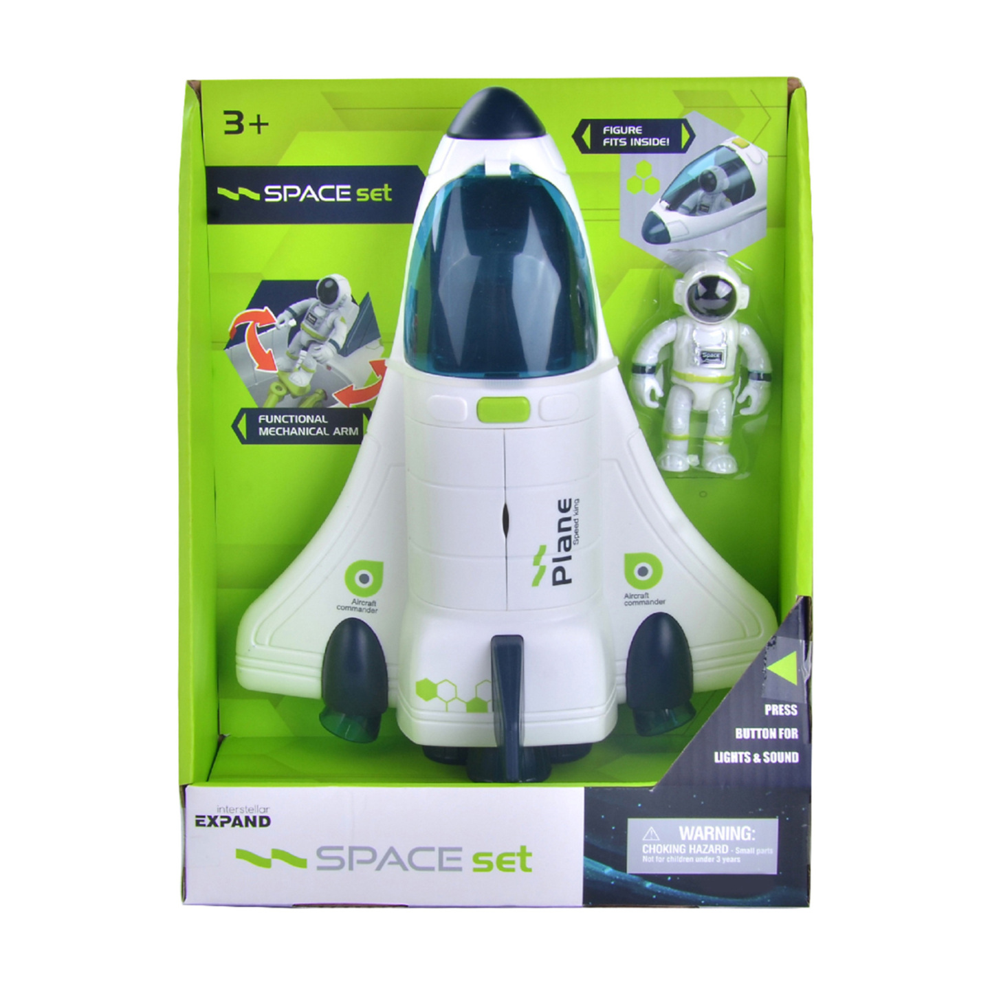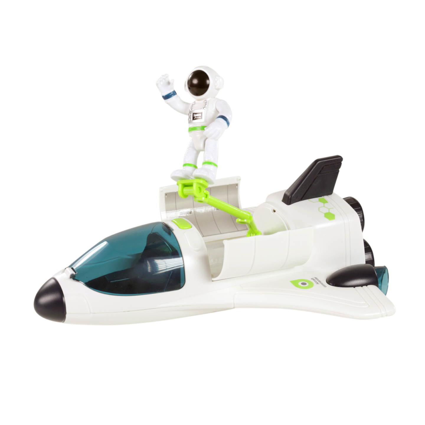 Raketoplán se zvukem a světlem. Otevíratelná kabina, součástí balení je i postavička kosmonauta. Funguje na 2 x AAA 1.5V baterie, které nejsou součástí balení. Velikost raketoplánu je 25 cm.
