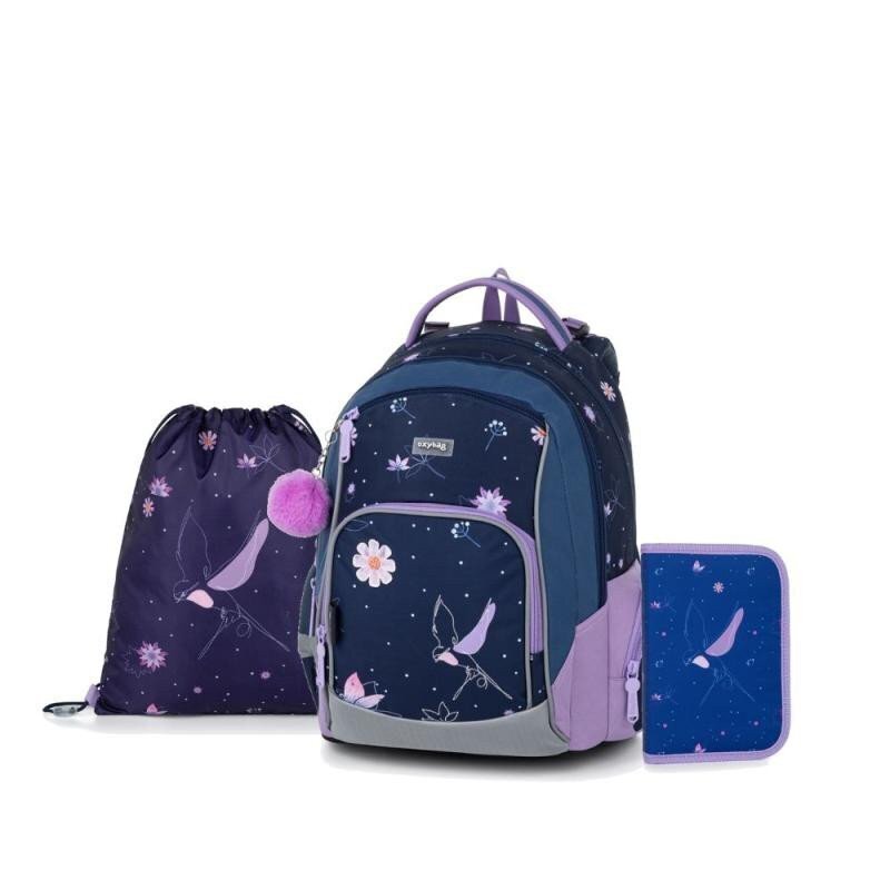 potřeb. Na vnitřních chlopních jsou průhledné fólie pro rozvrh hodin. Sáček: Sáček na přezůvky. Uzavírání stažením šňůrek, možnost nosit i na zádech nebo připevnit ke školnímu batohu. Materiál 100% polyester.