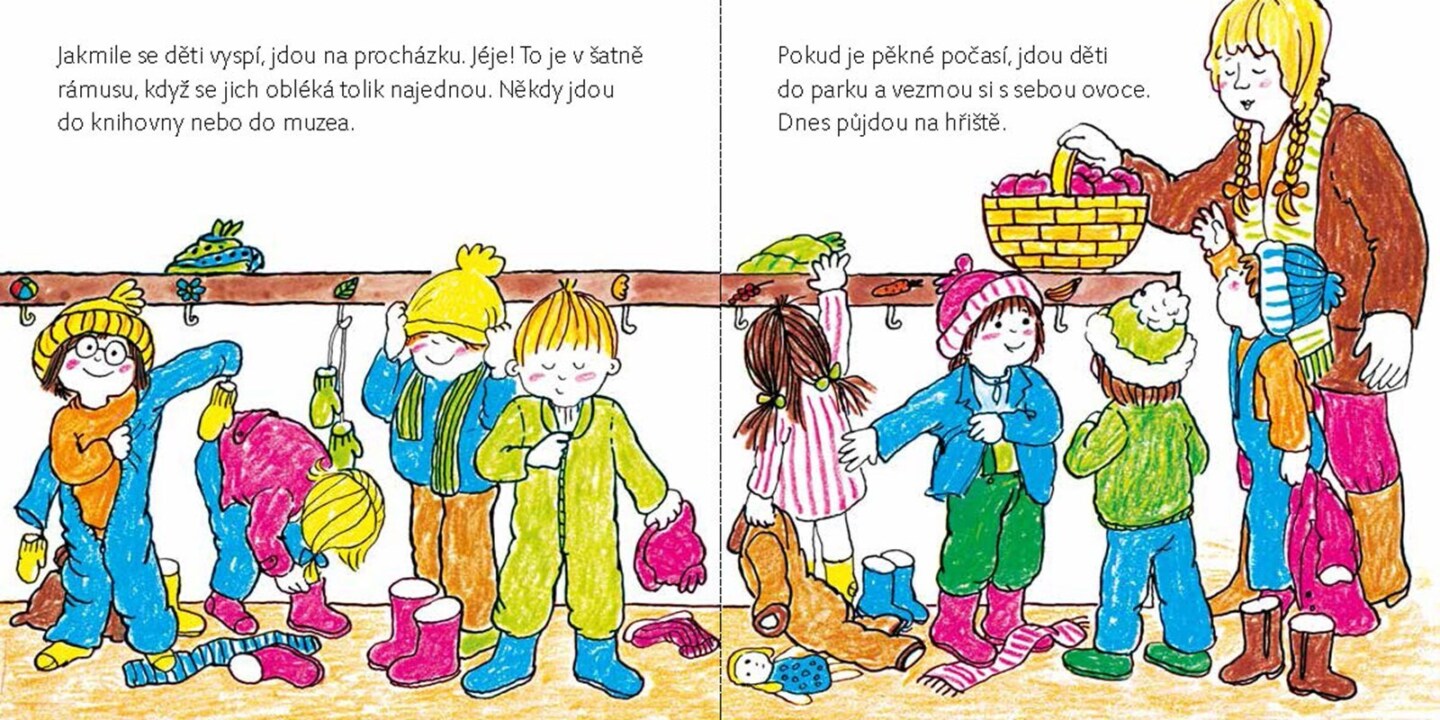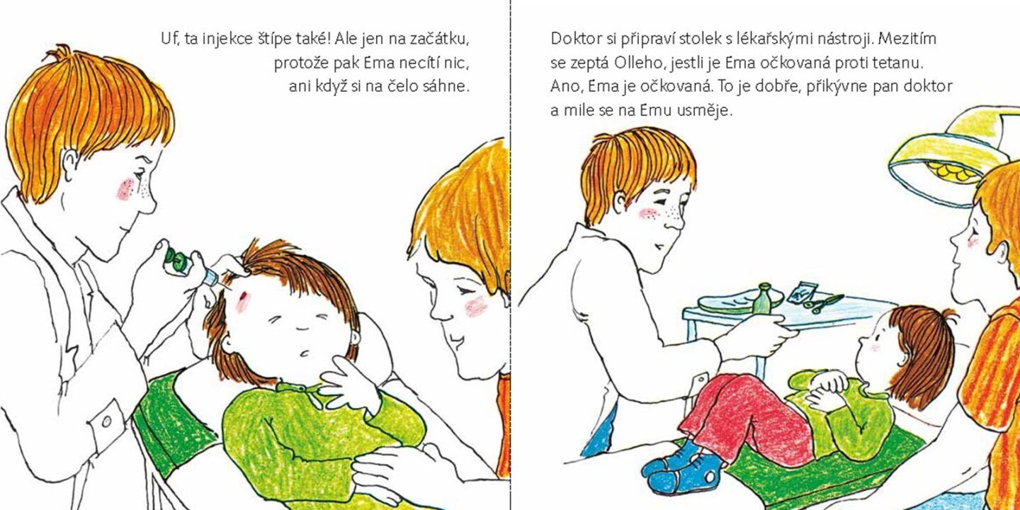 Ema chodí do školky ráda. Nejvíc si hraje s Nelou, i když se občas pošťuchují. Ve školce Emu všechno baví, někdy se jí ani nechce domů a maminka musí počkat, než si Ema dohraje. Děti mají ve školce strom, na který mohou šplhat. Tentokrát se Ema s Nelou nepohodly, až Ema spadla. A dole byly dva...