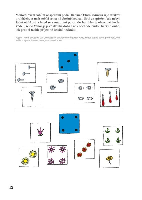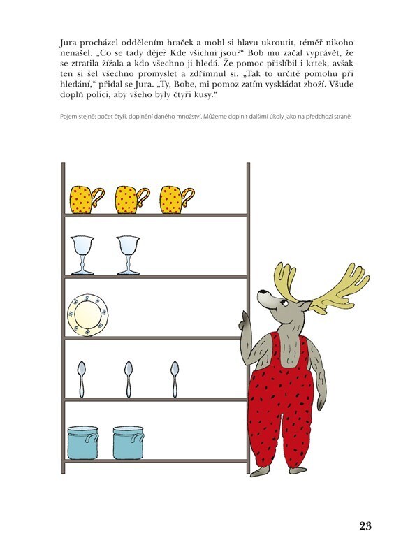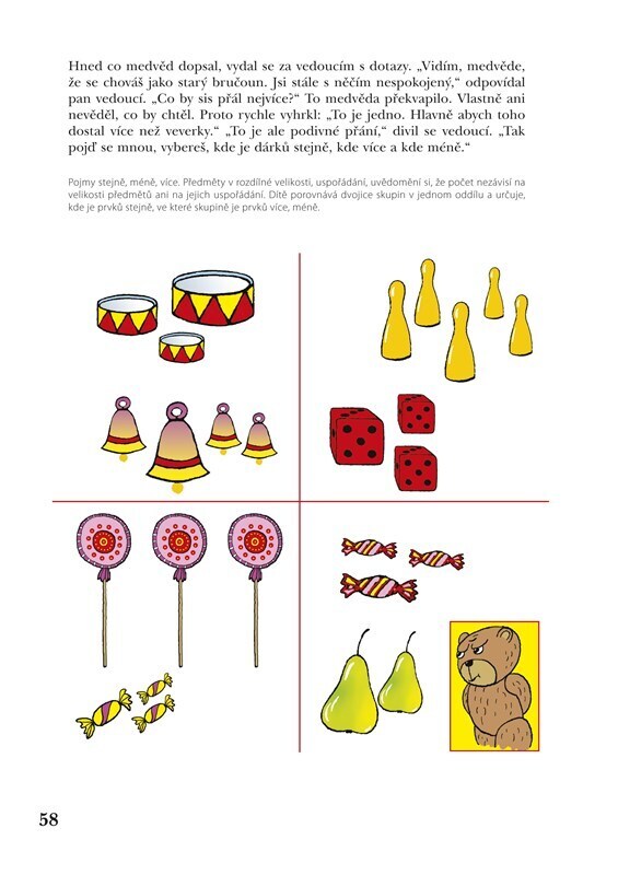 Publikace je určena předškolním dětem k rozvoji matematických schopností a prevenci potíží v matematice po zahájení školní docházky, zároveň rozvíjí matematické nadání, přemýšlení. Při práci s knihou se budují základní matematické pojmy jako např. všechny, některé, málo, hodně, stejně, méně,...