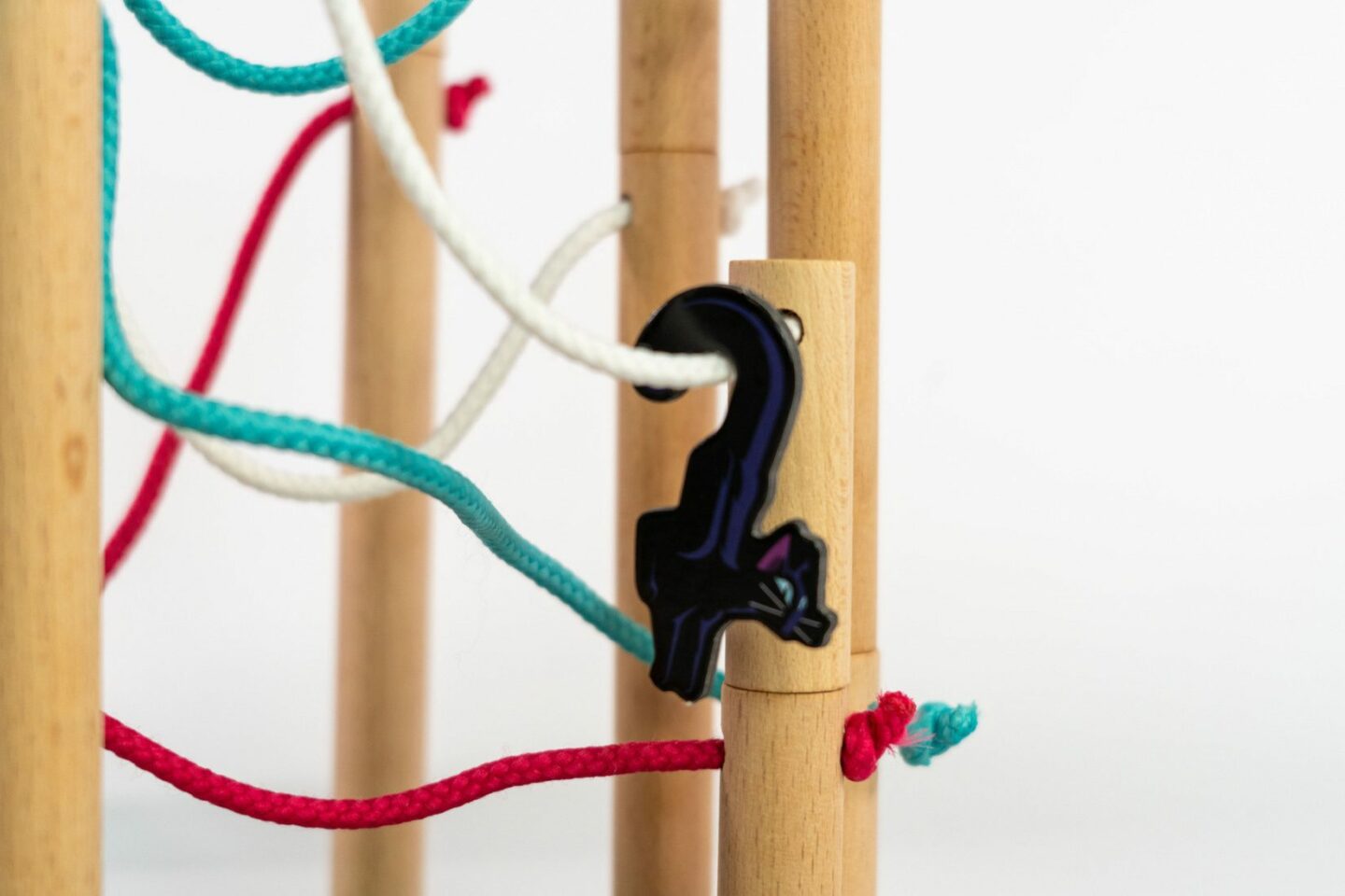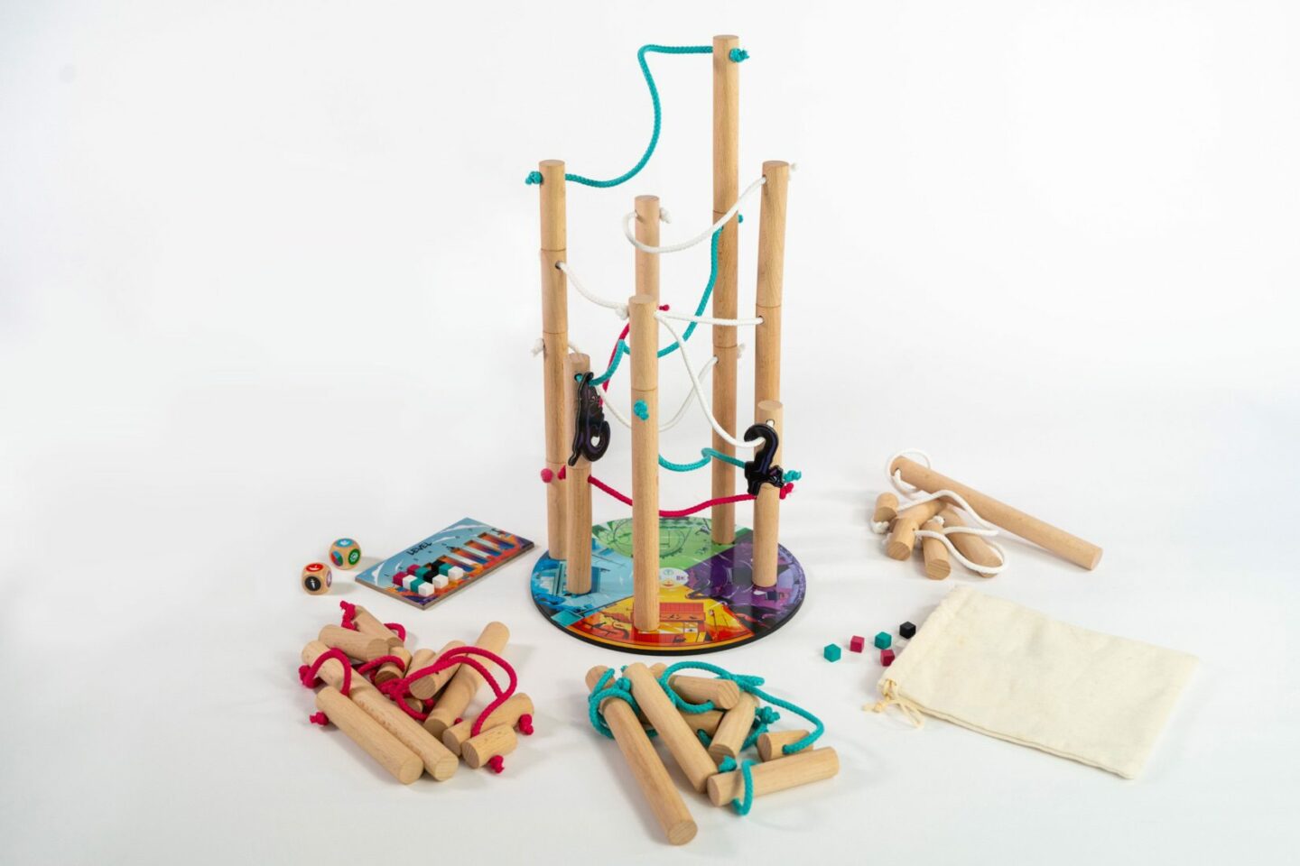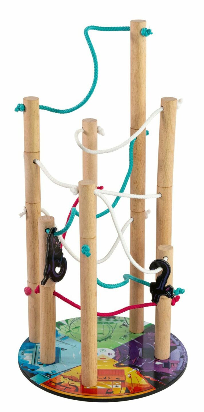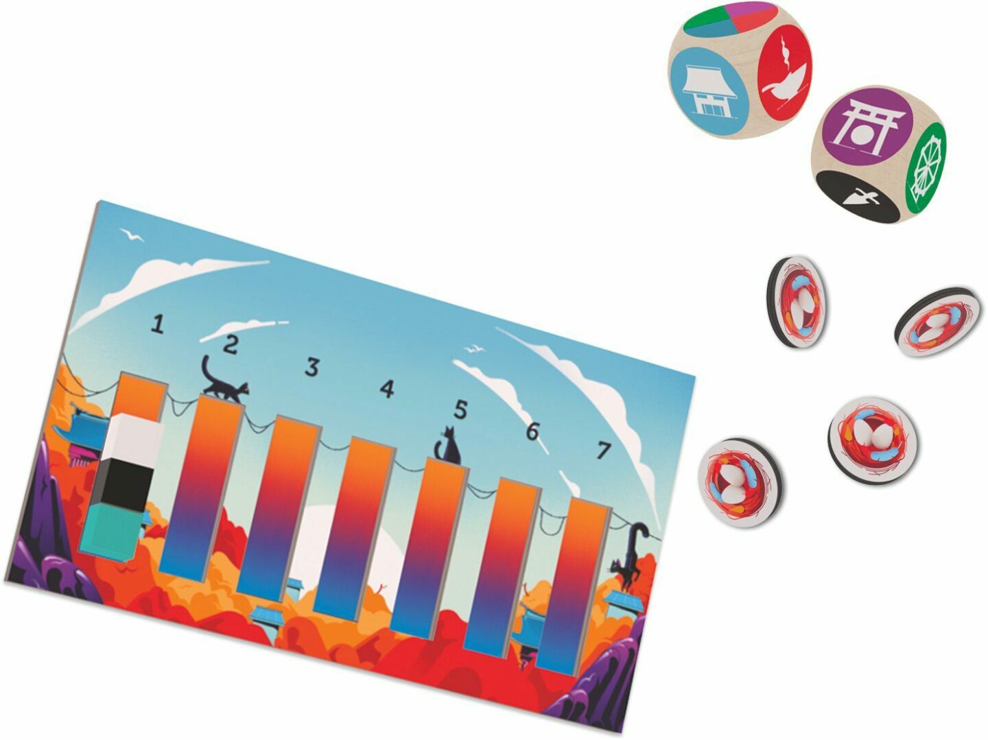 sloupů z bukového dřeva spojených provázkem 28 dřevěných barevných kostiček 1 pytlík 2 dřevěné kostky 7 žetonů koček 20 žetonů ptačích hnízd 1 počítadlo úrovní 1 pravidla