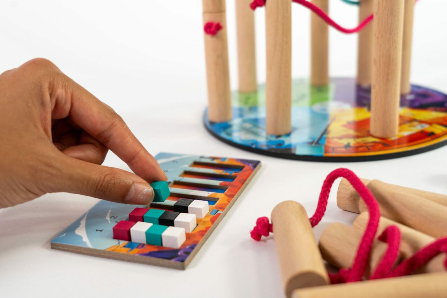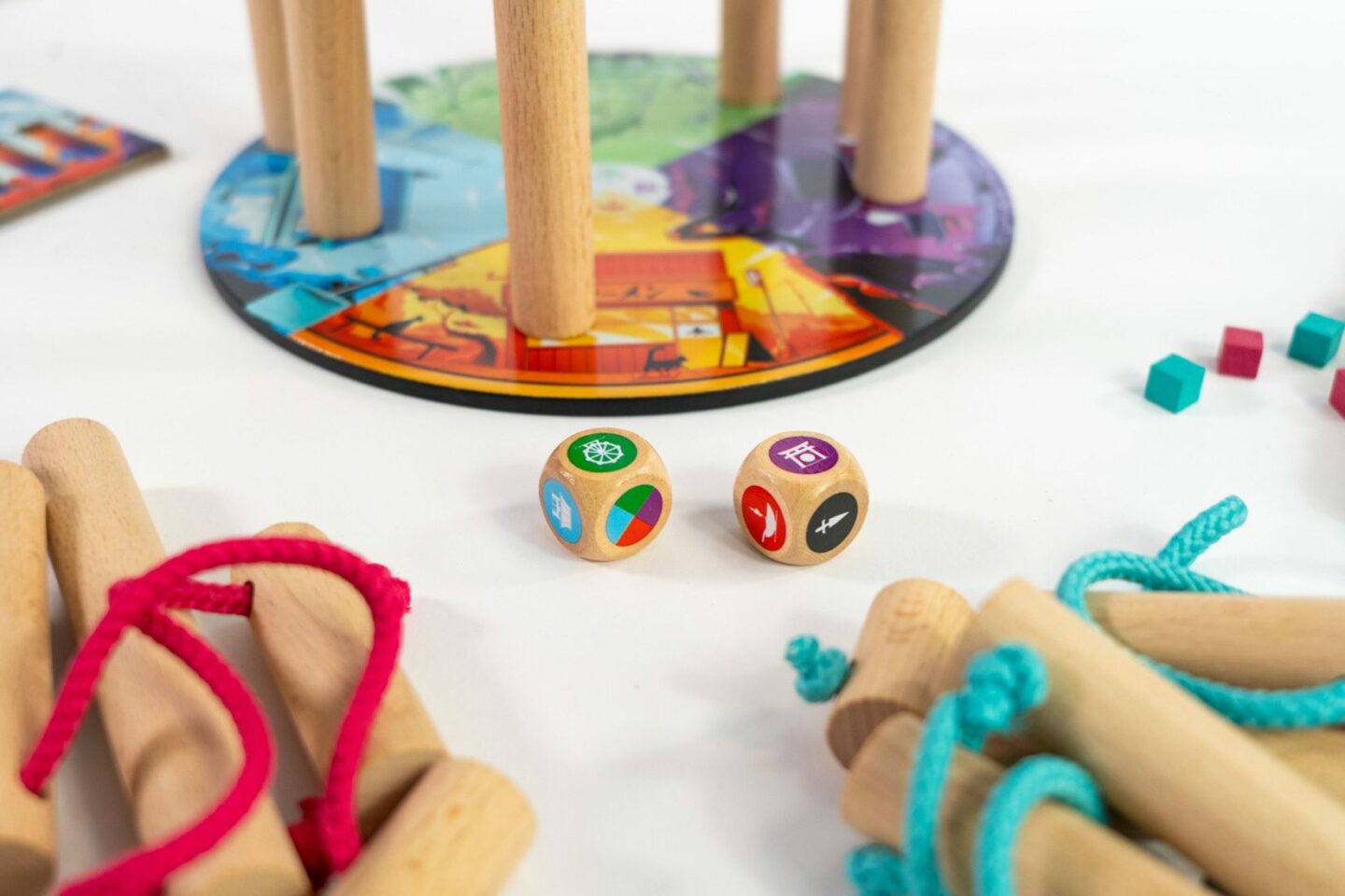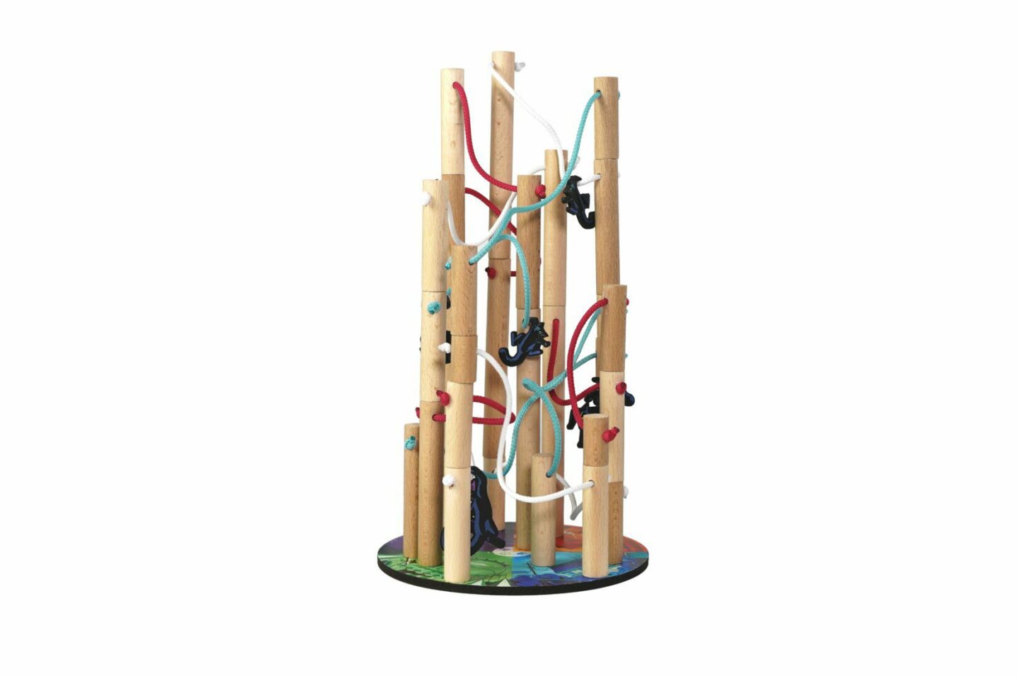 sloupů z bukového dřeva spojených provázkem 28 dřevěných barevných kostiček 1 pytlík 2 dřevěné kostky 7 žetonů koček 20 žetonů ptačích hnízd 1 počítadlo úrovní 1 pravidla