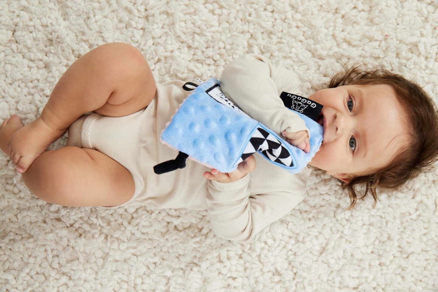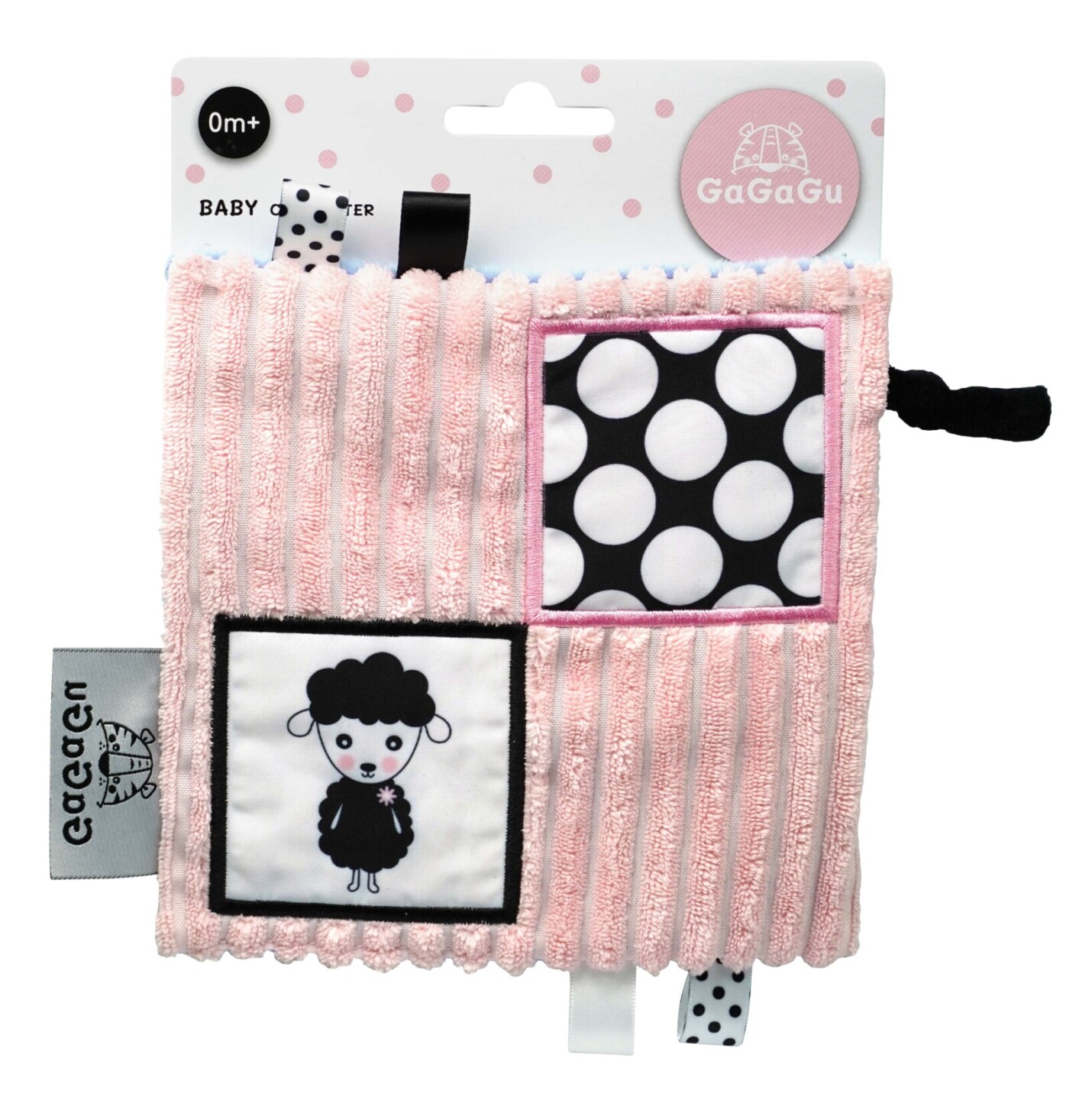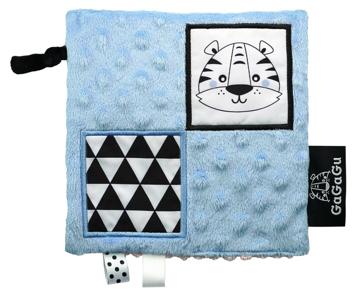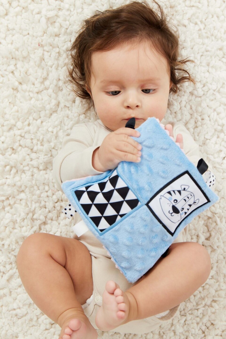 Dečka má kontrastní barvy a vzory, což stimuluje zrak dítěte a šustivý materiál uvnitř hračky stimuluje jeho sluch. Dítě má možnost poznávat různé textury, díky kterým si rozvíjí hmat. Doplňkové stuhy, plyšová poutka, velký štítek - usnadňují dítěti uchopení