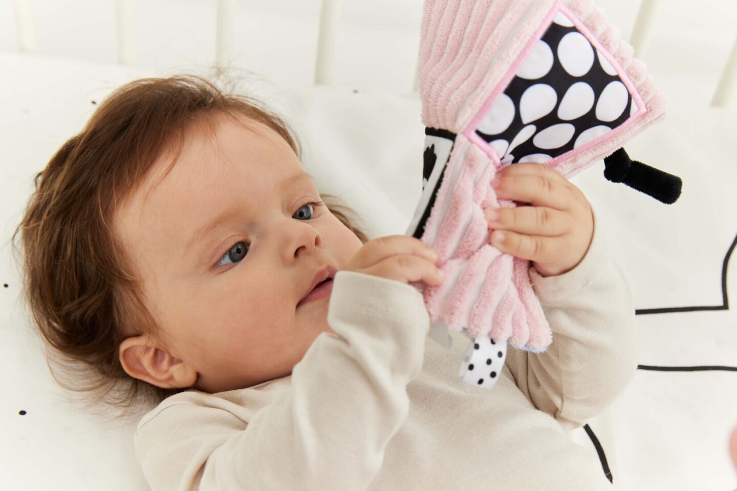 prodktu (v bodech):• kontrastní barvy a vzory – stimulují zrak dítěte• různé textury materiálu – stimulace hmatu• šustivý materiál – rozvoj sluchu• různé prvky (stuhy, poutka, štítek) - podpora jemné motoriky (pohyby prstů a rukou)• lehká a šikovná hračka – na