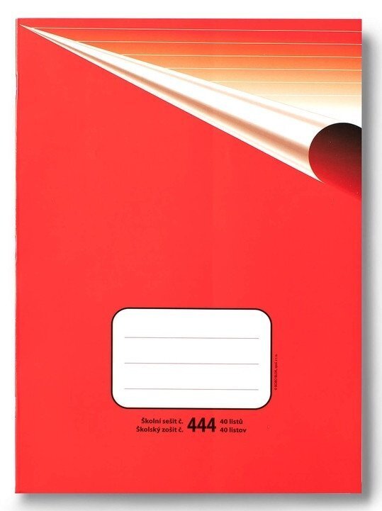 Klasický školní sešit číslo 444, formát A4, 40 listů, linkovaný, 8 mm linky. br brŠkolní sešity mají pevnou papírovou obálku v klasickém retro designu. Na přední obálce je několikařádkový prostor pro nadepsání jména a příjmení, třídy nebo školního předmětu. br