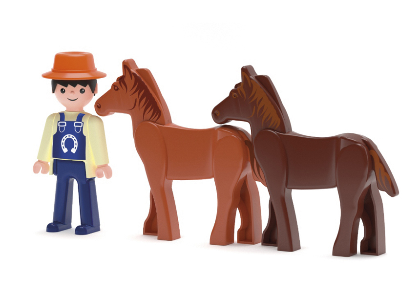 Farmář a jeho krásní koníci si spokojeně žijí na farmě. Mají se ale co otáčet. Koníci potřebují nakrmit. Za odměnu farmářovi pomohou vytahat dřevo z lesa. Hračka rozvíjí jemnou motoriku a fantazii dětí. Legendární postavička od roku 1976. Vyrobeno v ČR.