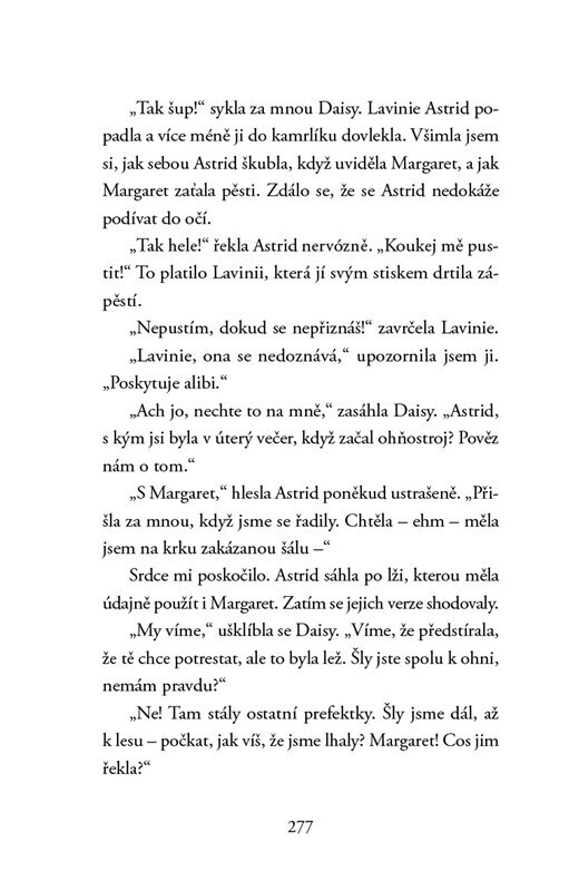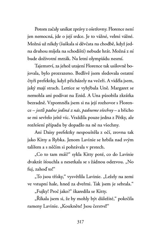 Návrat do lavic má pro Daisy a Hazel trpkou pachuť. Nová školní předsedkyně Elizabeth Hurstová spolu se svou smečkou věrných prefektek šikanují mladší ročníky a nad školou se začíná vznášet mrak strachu a sváru. Pak ale Elizabet během ohňostroje přijde o život. Vypadá to jako nehoda, co když je...
