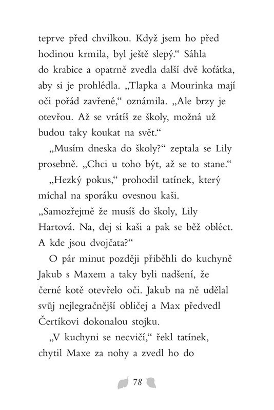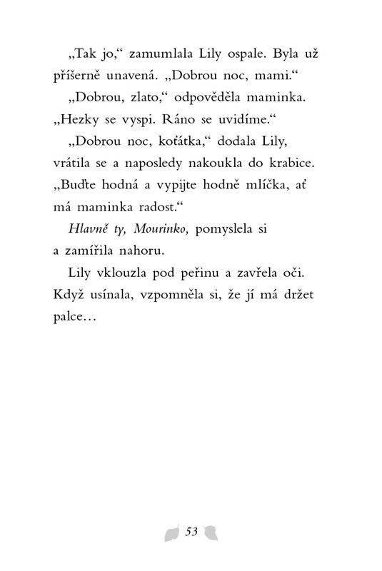 Maminka malé Lily přinese domů tři slabá koťátka, která se našla opuštěná venku pod keřem. Kočičí miminka potřebují hlídat a pravidelně krmit. Celá rodina, včetně fenky Meg, si malé chlupáče ihned zamiluje. Lily se snaží co nejvíce pomáhat a o mláďátka pečovat. Podaří se koťátka zachránit,...