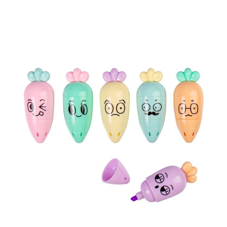 Sada 6 různobarevných zvýrazňovačů ve tvaru baby karotky je ideální pro děti do školy, nebo do hravé kanceláře. Jednotlivé barvy zvýrazňovačů: žlutá, růžová, zelená, fialová, modrá, oranžová.