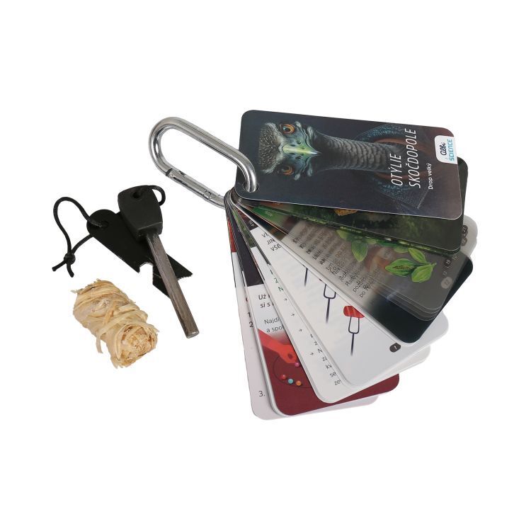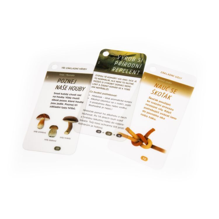 Krabičky pravého dobrodruha vás hravou formou připraví na nejsvízelnější situace, které by mohly v přírodě nastat. Krabička pravého dobrodruha - Na chatu obsahuje: ostrý skládací nůž, 30 plastových karet se zajímavostmi, karabinu na uchycení karet, návody, pravidla a tipy.