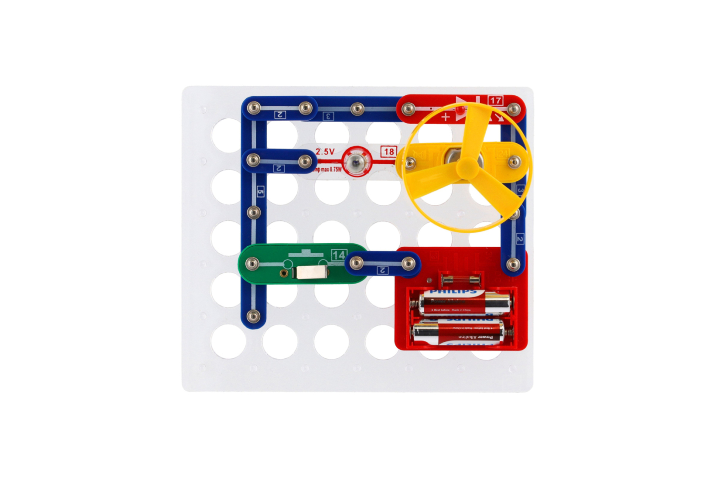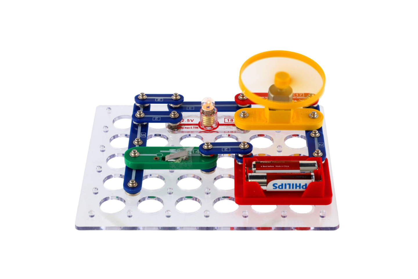 Elektronická stavebnice, ze které lze sestavit dle návodu až 80 projektů. Děti si mohou sestavit vlastní FM rádio. Běhěm hry děti poznají práci motoru, přepínačů nebo zdrojů zvuku a světla. V krabici 30x24,5x3,5 cm. Vhodné od 6 let.