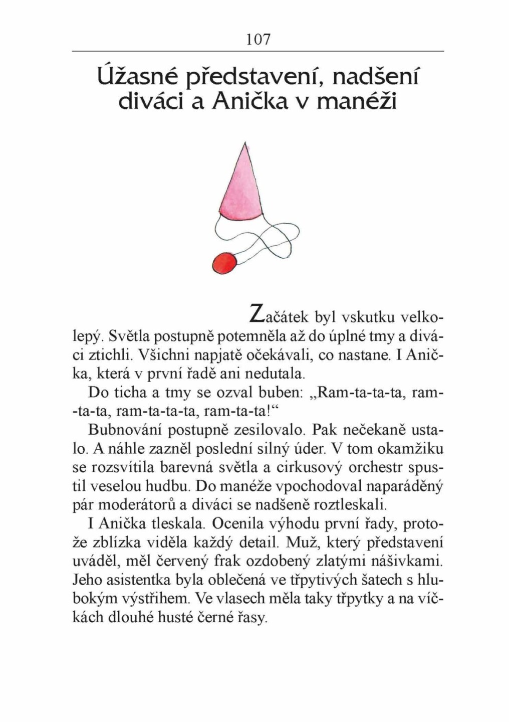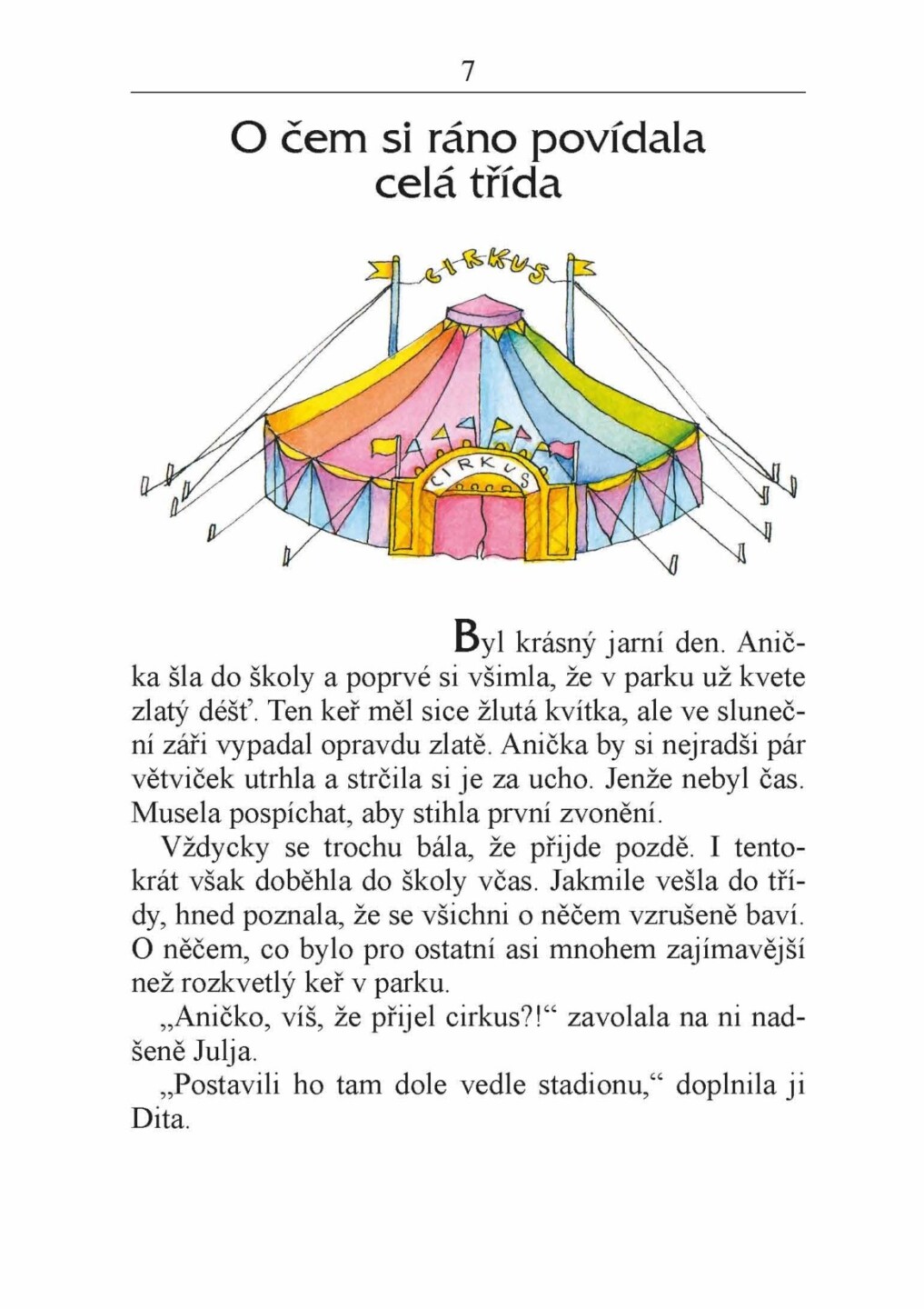 Cirkus přijel! nese se ráno nadšeně celou třídou. Anička se hned domluví s kamarádkami, že se po vyučování poběží k šapitó podívat. Anička je cirkusovým prostředím okouzlená – tak ráda by taky vystupovala v sobotním představení. Proto se na místo pozdě odpoledne ještě jednou vrátí. A potká se s...