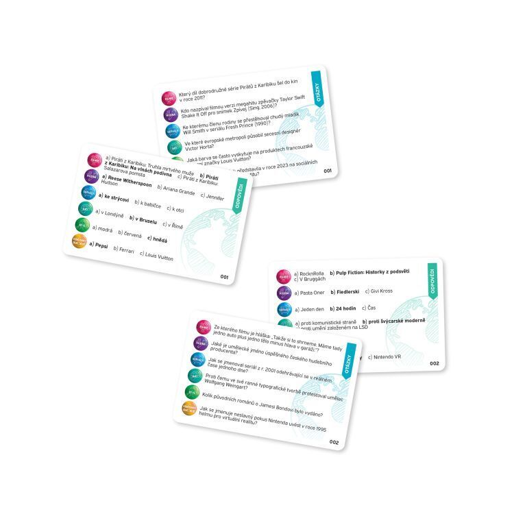 Úspěšná kvízová hra "Otázky a odpovědi" s novým tématem. Otestujte své znalosti popkulturního prostředí v této legendární kvízové hře. Hra Popkultura - Otázky a odpovědi obsahuje: herní plán, 400 karet s otázkami, 36 žetonů, 6 figurek, 1 kostku.