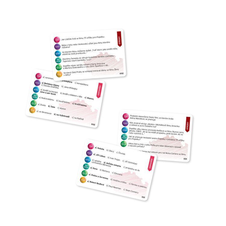 V této hře naleznete 2 400 kvízových otázek týkajících se filmové branže, které jsou rozdělené do 6 okruhů: filmy, herci, filmové hlášky, děti a mládež, tv tvorba a různé. Hra Český film - Otázky a odpovědi obsahuje: herní plán, 400 karet s otázkami, 36 žetonů, 6 figurek, 1...