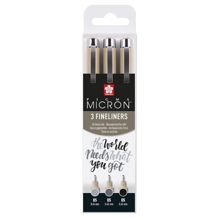 Výběr 3 ks fixů Pigma Micron 05 v barvách černá, studená šedá a světlá studená šedá (šířka linky: 0,45 mm). S těmito stavitelnými šedými linkami můžete přidávat stínování, hloubku, vizuální akcenty a efekty vrstvení do ilustrací, kreseb, rozpisů bullet journalu a
