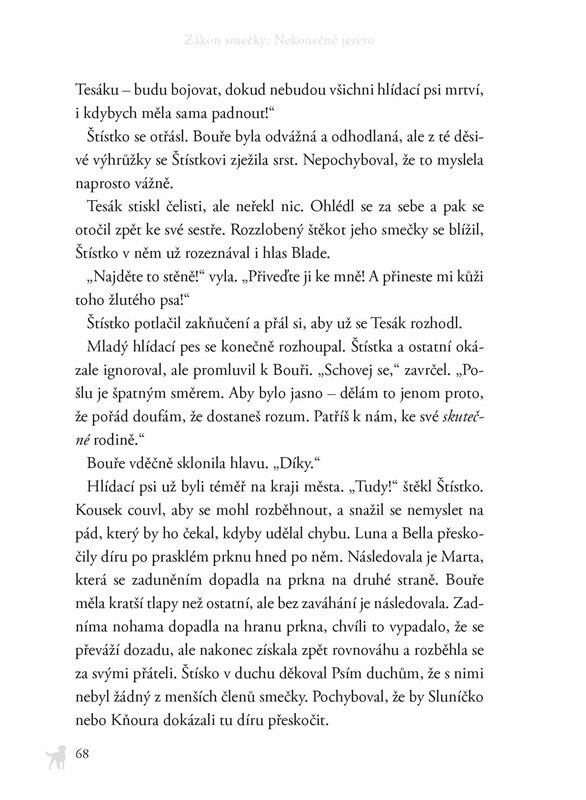 Pátý díl populární zvířecí ságy. Štístko a jeho smečka se dokázali ubránit Běsovi, nelítostnému vůdci cizí tlupy. Přesto nejsou v bezpečí. Jezero, ke kterému doputovali, se zdá být nekonečné a nelze v něm ulovit žádnou kořist. Zima se blíží a smečka prahne po jídle a suchém přístřeší. Alfa všem...