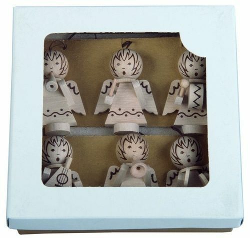 Přírodní vánoční dekorace s motivem andělíčků hrajících na hudební nástroje. Šest figurek o velikosti 50 mm s očkem na zavěšení. Ideální ozdoby na vánoční stromek. Krásný dárek. Výrobek splňuje požadavky EU na bezpečnost hraček a je vhodný pro děti od 3 let.