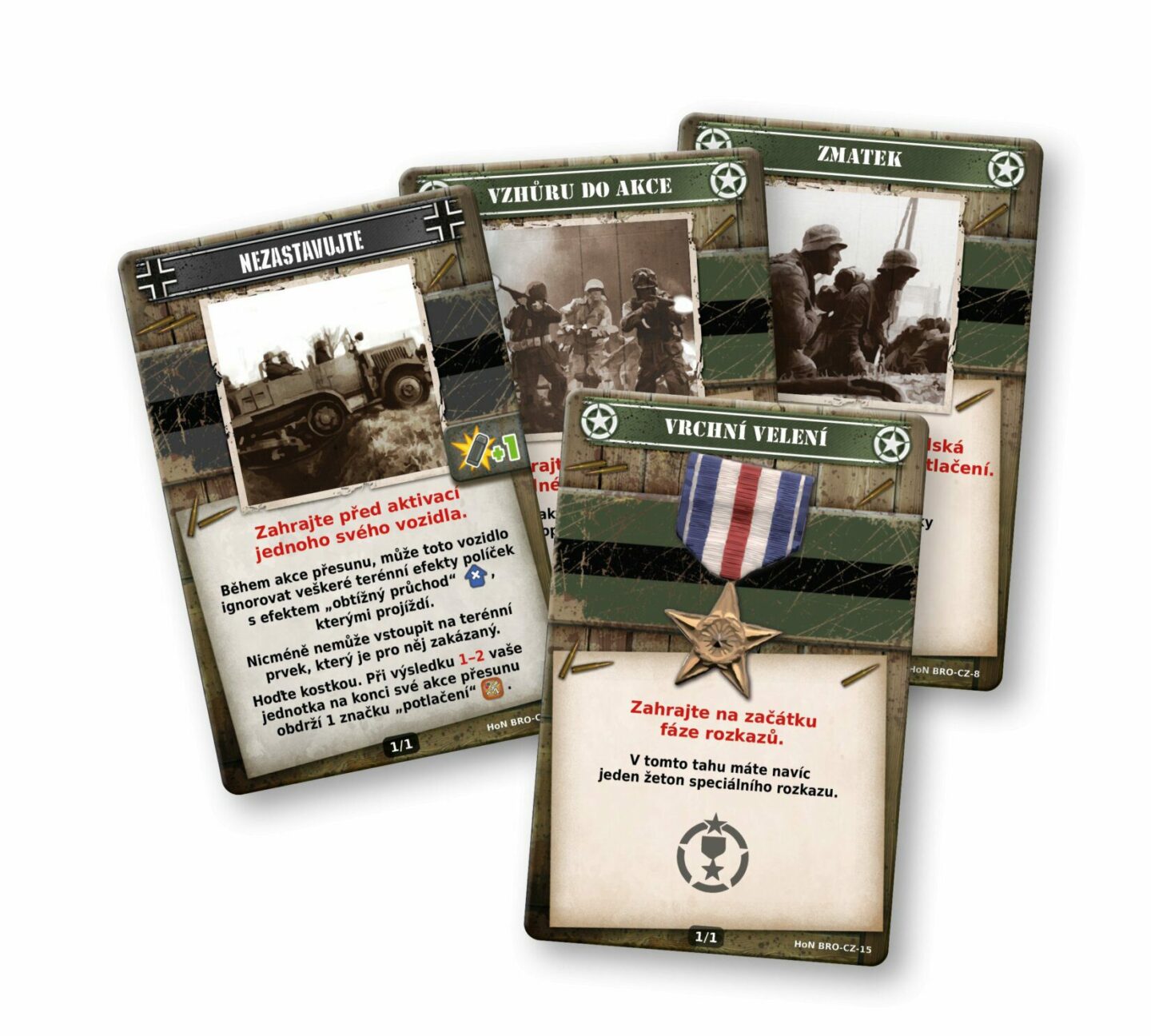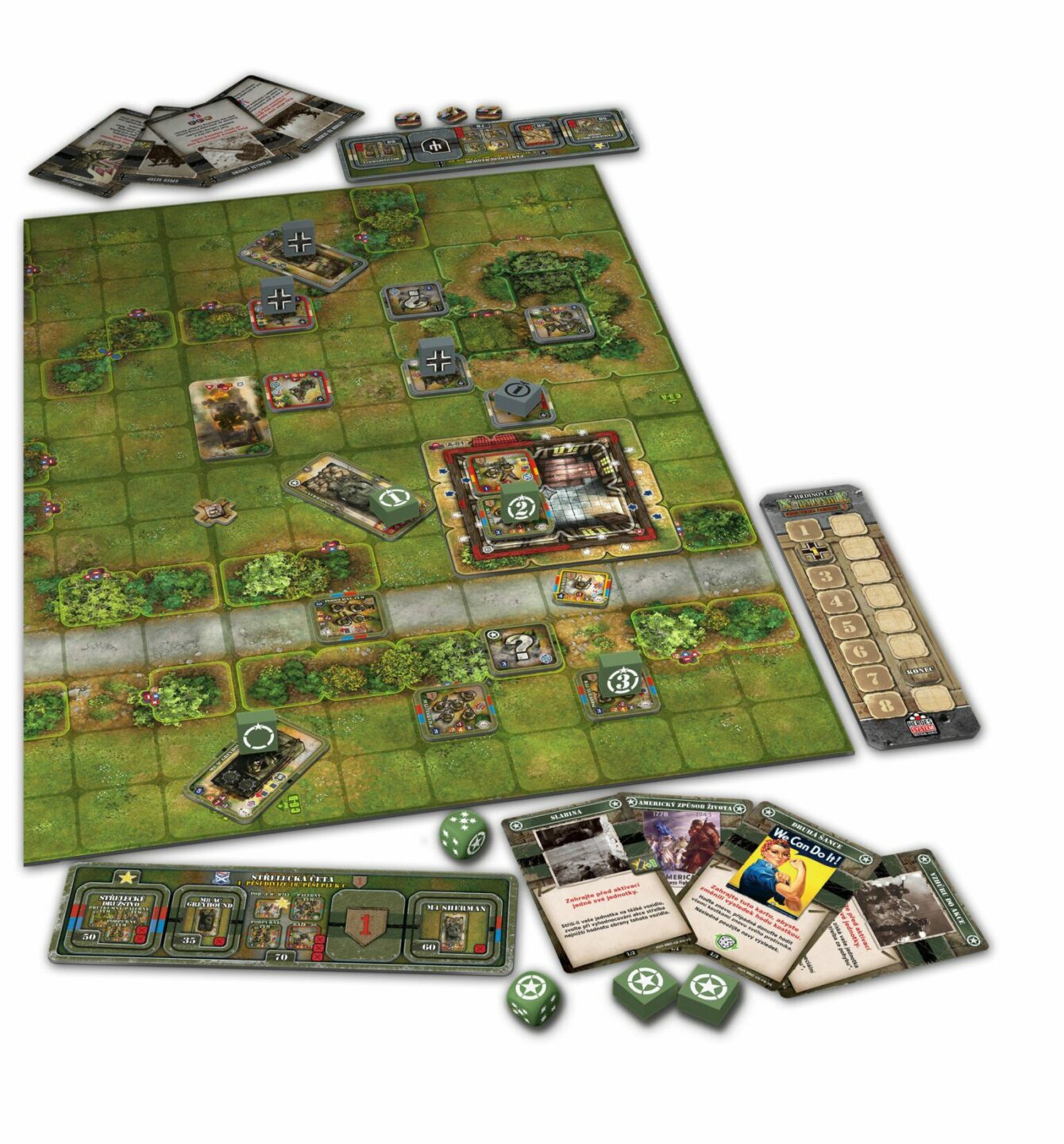 němečtí) 28 dřevěných ukazatelů rozkazů 2 americké kostky 2 německé kostky 6 oboustranných herních desek 1 počítadlo tahů a speciální značky 2 balíčky po 50 kartách 3 zničitelné domy 7 terénních prvků 1 kniha pravidel 1 kniha scénářů