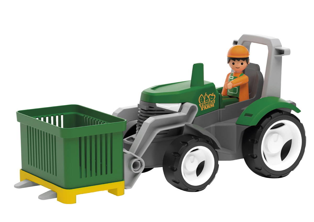nakladacími vidlemi, paletu, paletový koš a vyměnitelnou nástavbu valníček. Set je doplněn figurkou Igráčka Farmáře. • Po zvednutí kapoty traktoru se objeví zámkový systém, který umožňuje odejmout nakládací vidle, případně je vyměnit za samostatně dokoupitelnou