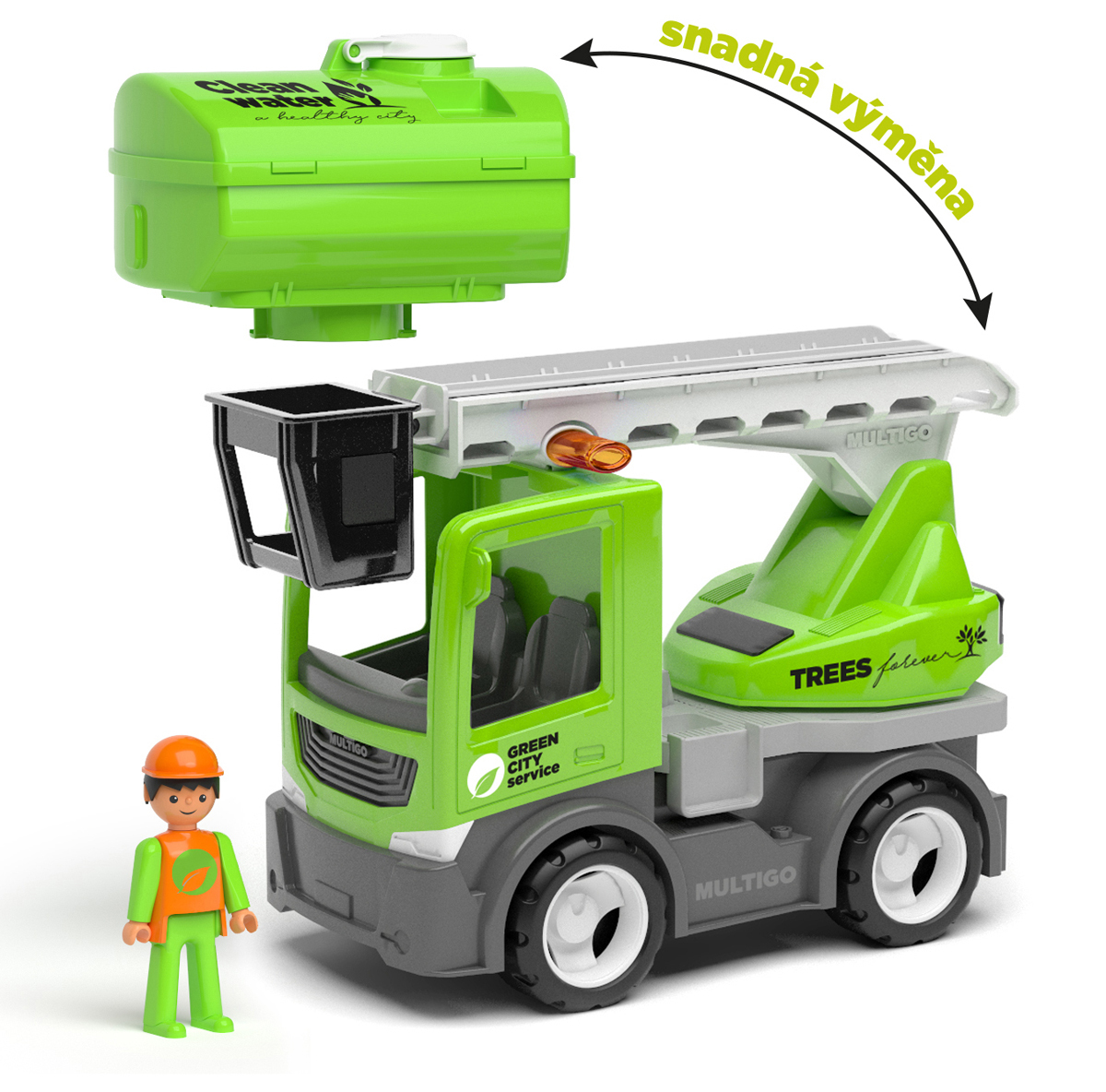 set obsahuje: auto – tahač, funkční žebřík, cisternu a figurku Igráčka. • Žebřík je otočný o 360°, výsuvný s pohyblivým aretovatelným ramenem i košem. • Cisterna má otevíratelné víko, je rozebíratelná a lze ji tak snadno vyčistit. • Igráčka lze