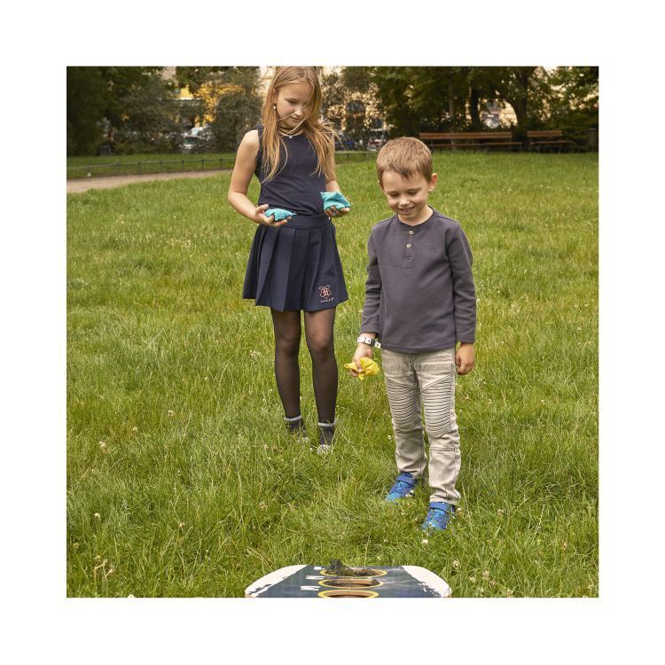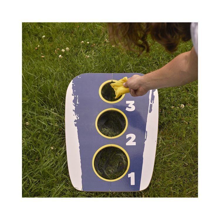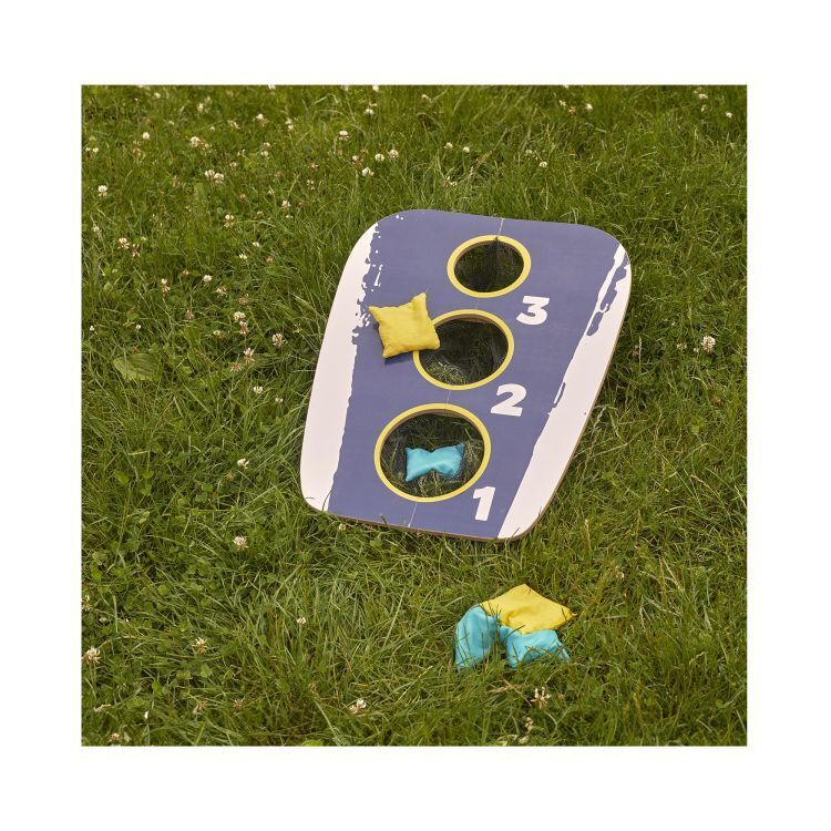Bean bag je házecí hra, ve které zvítězíte přesně mířenými hody! Obsah balení: Skládací herní deska, 4 nožičky, 6 látkových sáčků (3 žluté, 3 modré)