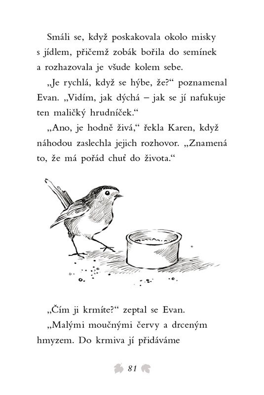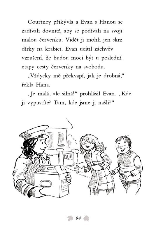 Evan s Hanou najdou ve sněhu promrzlou červenku. Chytila se do pasti a nemůže se hýbat. Hned zavolají na pomoc zvířecí záchranáře. Podaří se jim ptáčka vyprostit včas? Stále totiž velmi hustě chumelí a sněhu přibývá… Krásný příběh o lidech s dobrým srdcem, kteří pomáhají zachraňovat...