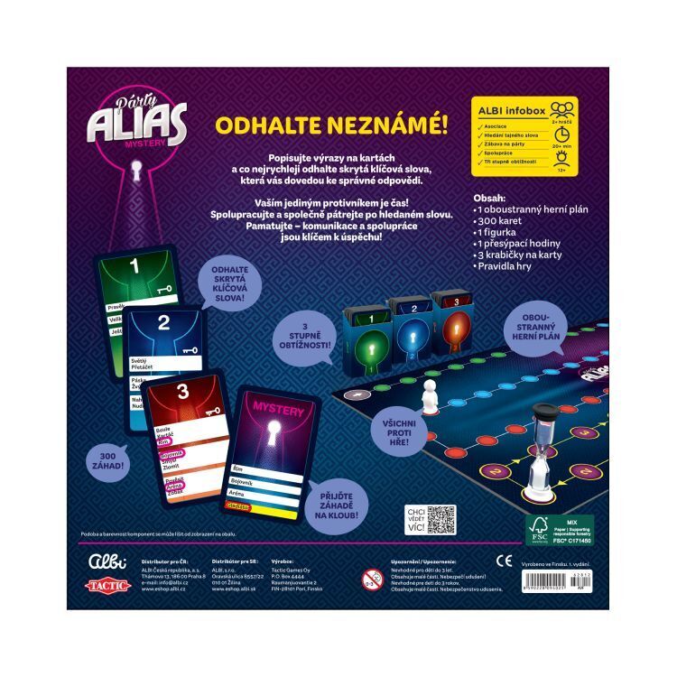Kooperativní hra na párty, ve které hráči nejprve hádají klíčová slova a poté společně pátrají po hledaném slovu. Pro 2 a více hráčů od 12 let. Hra obsahuje: 1 oboustranný herní plán, 300 karet, 1 figurku, 1 přesýpací hodiny, 3 krabičky na karty a pravidla hry.
