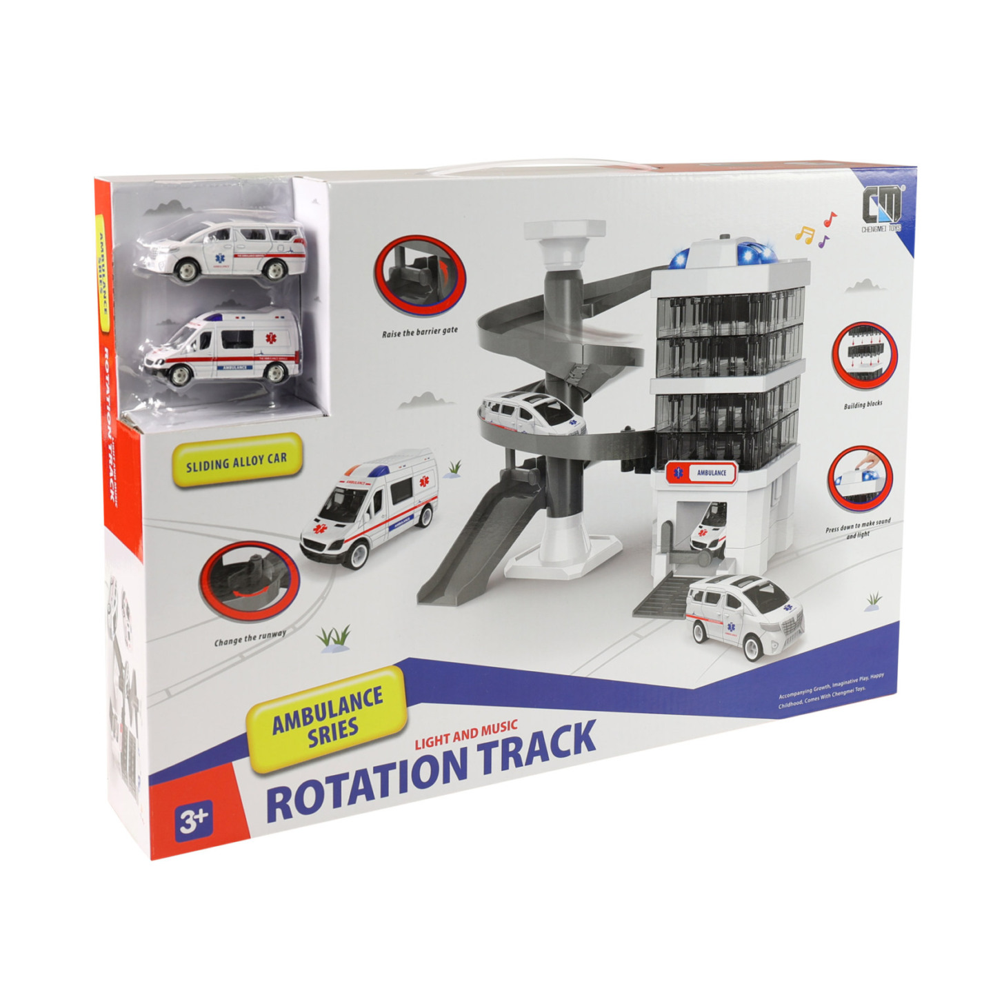 Nemocniční patrová budova se sjezdem. Střecha budovy disponuje majáčkem, který po zapnutí vydává reálné zvuky a bliká. K této funci je potřeba použítí 3 ks baterií typu LR44, které jsou uvnitř výrobku. Součástí této sady jsou 2 autíčka ambulance ve velikosti 7,5 cm.