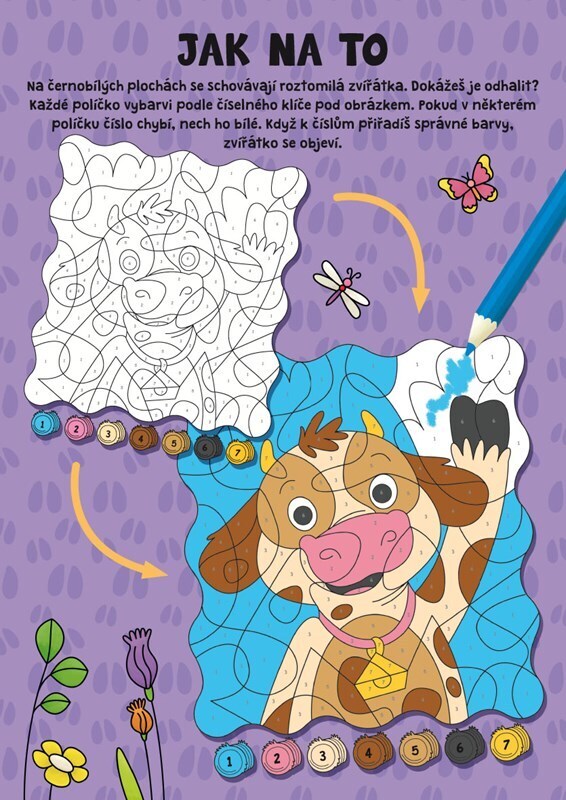 Vdechni život roztomilým zvířátkům pomocí pastelek a číselného kódu. Na 24 listech s černobílými plochami a očíslovaných políčky se ukrývají různí zvířecí kamarádi! Ještě před vybarvením mohou malí šikulové podle nápovědy zkusit uhodnout, co se v obrázku skrývá. Může to být např. kachna, kůň,...