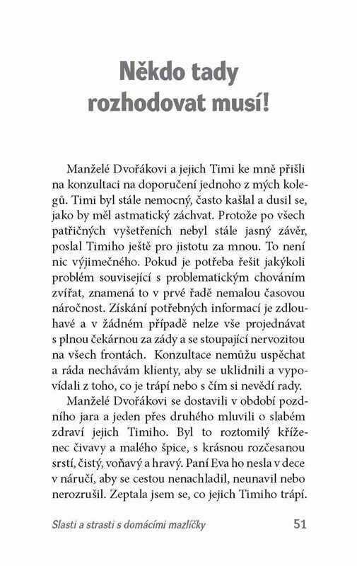 Pořídili jste si psa nebo kočku a oni se nechovají tak, jak jste očekávali? Známá veterinářka zabývající se poruchami chování zvířat vypráví ve své knize o mazlíčcích, s jejichž nevhodnými (alespoň s hlediska páníčků) projevy si jejich majitelé nevěděli rady. Dojemné i úsměvné příběhy psů a...