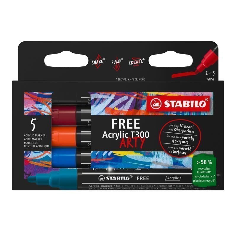 S řadou STABILO FREE Acrylic Marker můžete téměř neomezeně navrhovat a individualizovat. K dispozici jsou popisovače se třemi pečlivě vybranými variantami hrotů a až 20 krycími barvami. Neprůhledná a světlostálá pigmentová akrylová barva, vhodná na téměř všechny