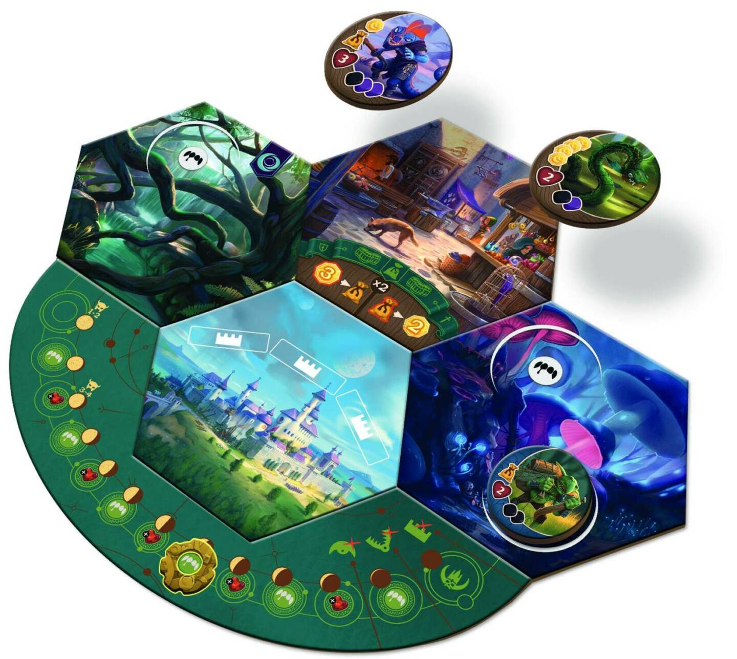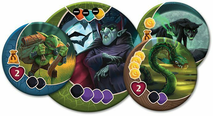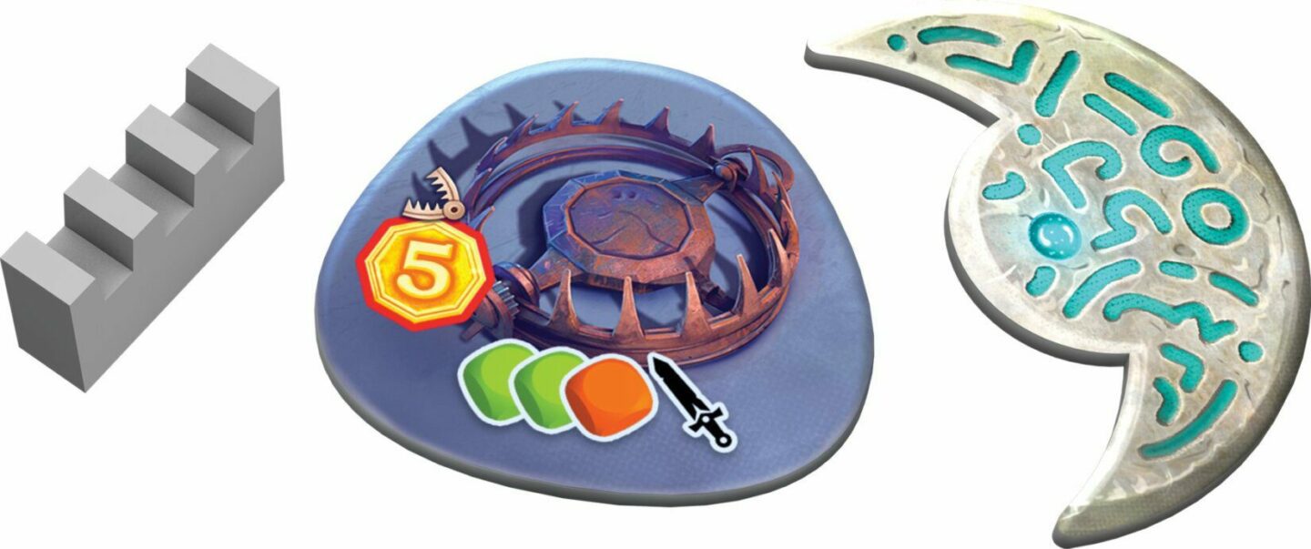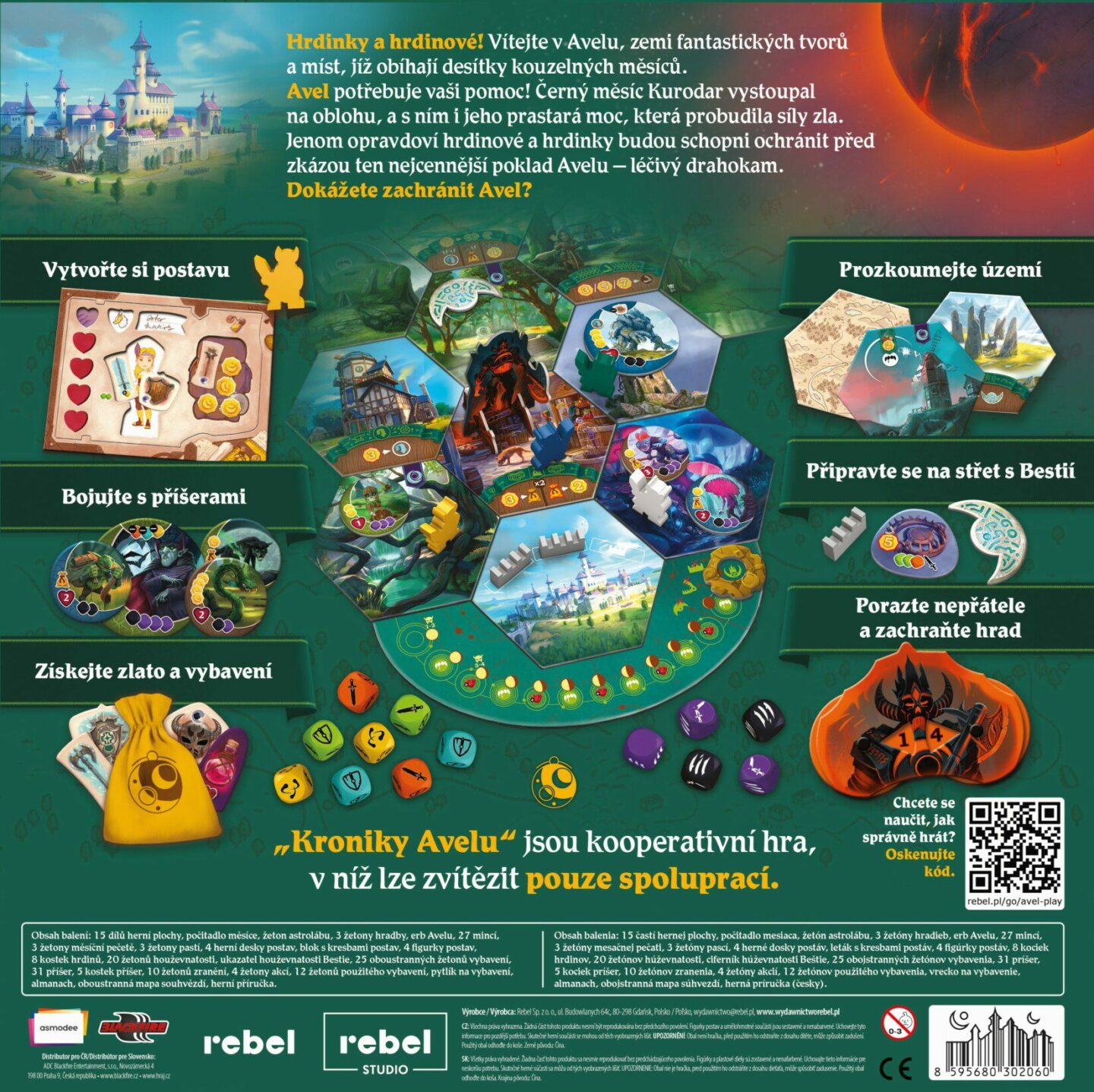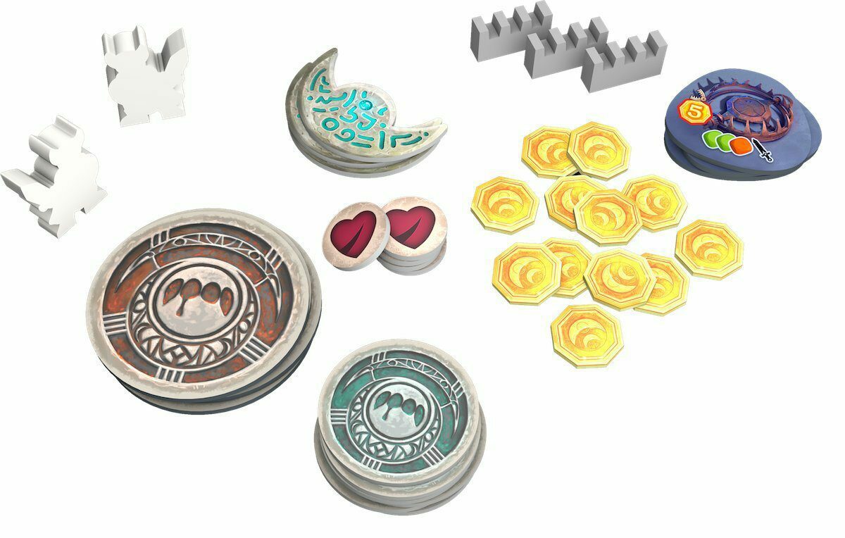 Obsah balení: 15 dílů herní plochy 1 počitadlo měsíce 1 žeton astrolábu 3 žetony hradby 1 erb Avelu 27 mincí, 3 žetony měsíční pečetě 3 žetony pastí 4 herní desky postav 1 blok s kresbami postav 4 figurky postav, 8 kostek hrdinů 20 žetonů houževnatosti 1 ukazatel