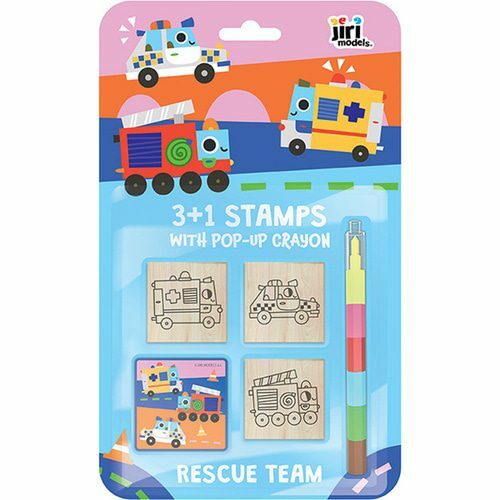 Set obsahuje 3 snadno uchopitelná dřevěná razítka, barevnou podušku s oblíbeným motivem a šestibarevnou skládací voskovku pro vybarvování.