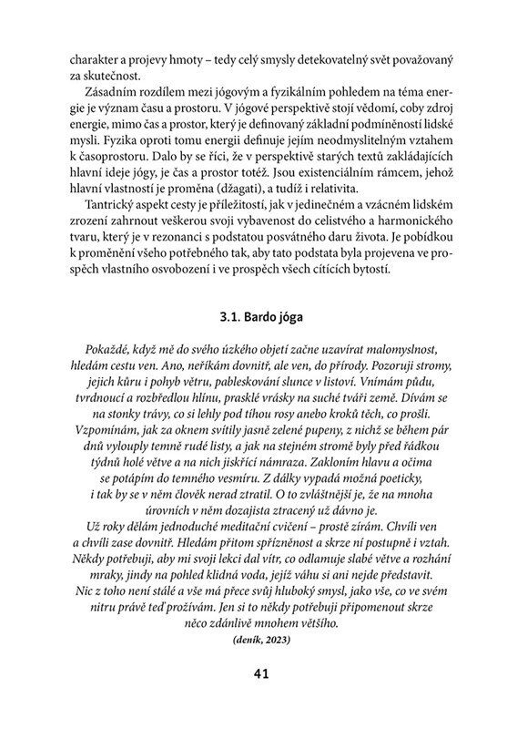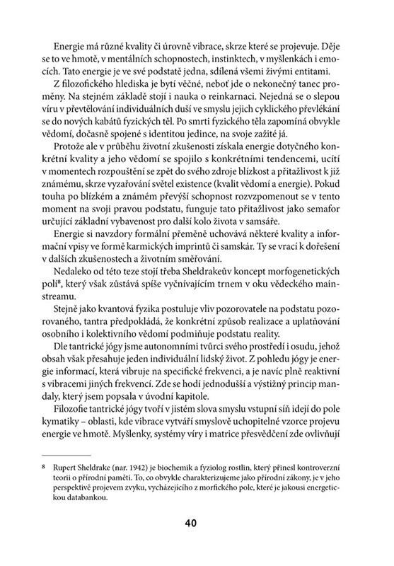 Kniha představuje unikátní multižánrové dílo a přibližuje čtenářům důležité principy tantrické jógy ve spojení s perspektivou transpersonálního paradigmatu tak, že z nich mohou čerpat ve svém životě.