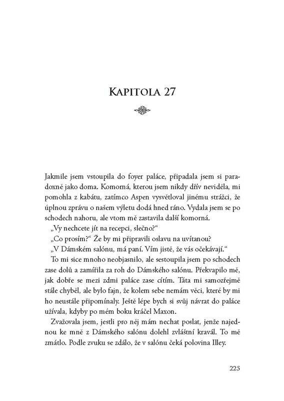 Když byla America vybrána do Selekce ani ve snu by ji nenapadlo, že by se ocitla na dosah samotné koruny, natož k srdci prince Maxona. S blížícím se koncem soutěže narůstají hrozby za branami paláce a America si uvědomuje, jak je lehké všechno ztratit a jak těžce bude muset za svou budoucnost...