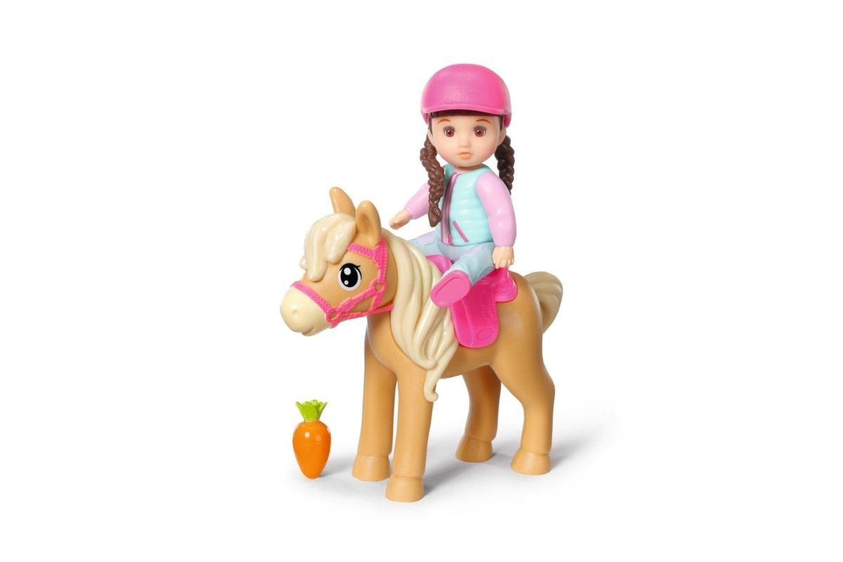 Roztomilá mini panenka Kim je připravena na vyjížďku ve svém elegantním jezdeckém oblečku se slušivou růžovou helmou. Jejímu koníkovi se ale dnes ven moc nechce. Nevadí! Kim totiž ví jak na něj a má připravený trik. Pomocí lahodné mrkvičky koníka chytře vyláká ze stáje a za chvíli už jsou oba...